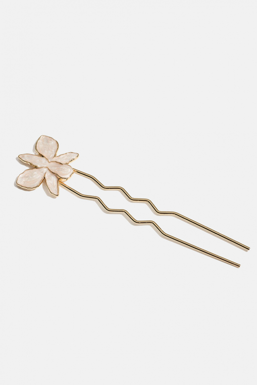 Ranskalainen hiusneula kullanvärisestä metallista, koristeltu valkoisella kukalla.