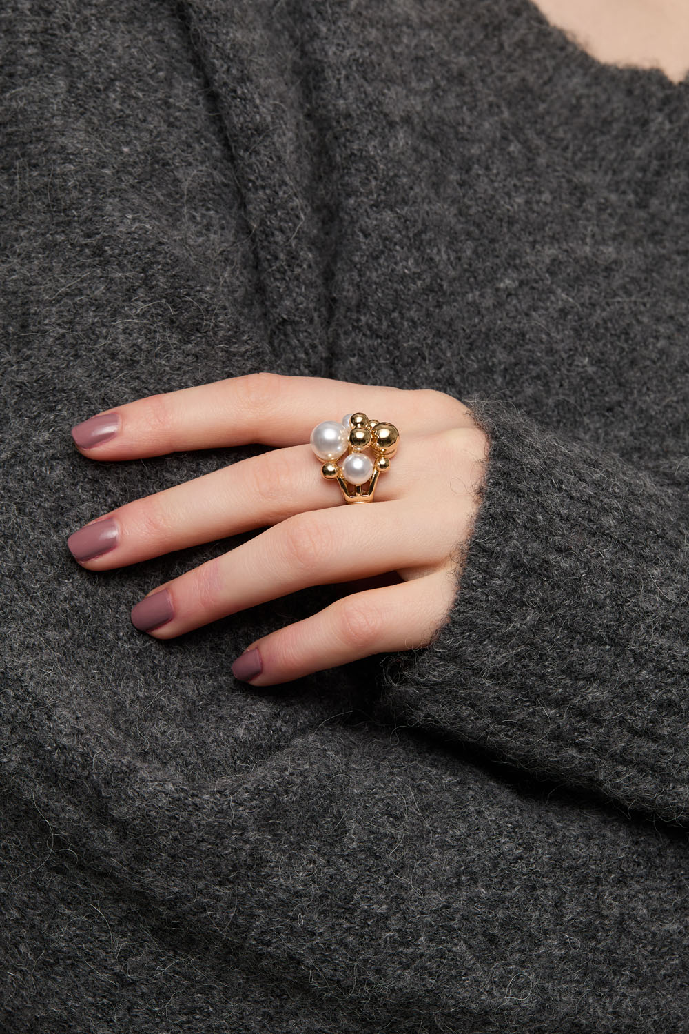 Säädettävä sormus kullanvärisestä metallista, jossa on valkoisia ja kullanvärisiä helmiä.