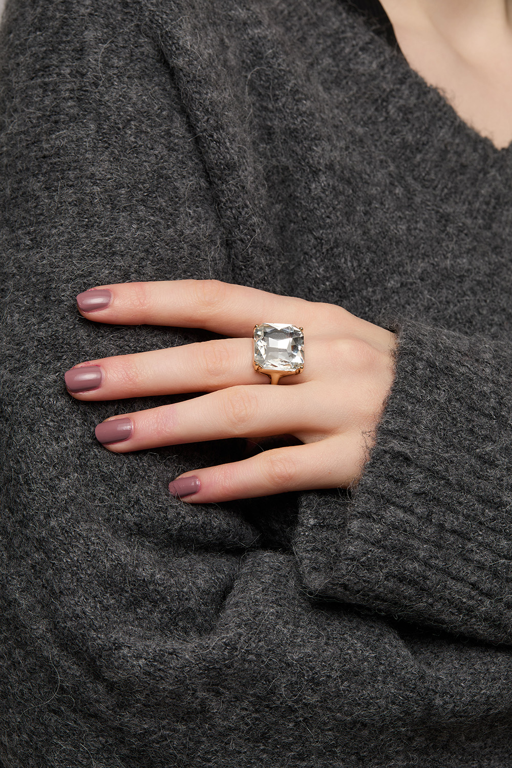 Kullanvärinen metallisormus, jossa on suuri, neliön muotoinen valkoinen lasikivi.