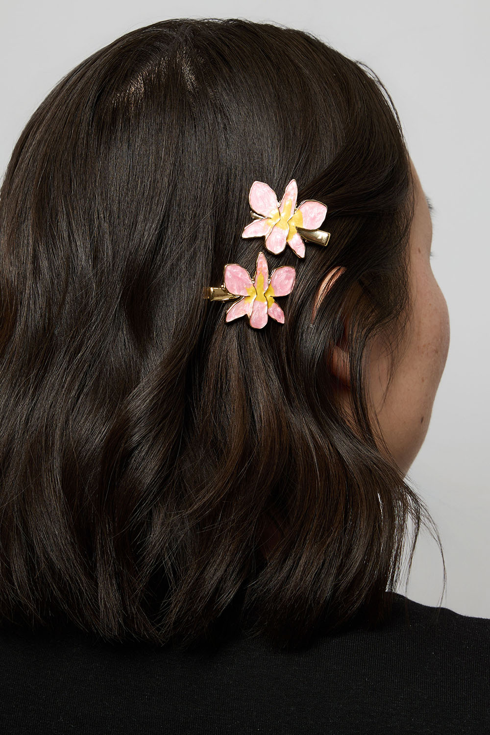 2 kullanväristä metallista hiusklipsiä, joissa on vaaleanpunaisia kukkia.