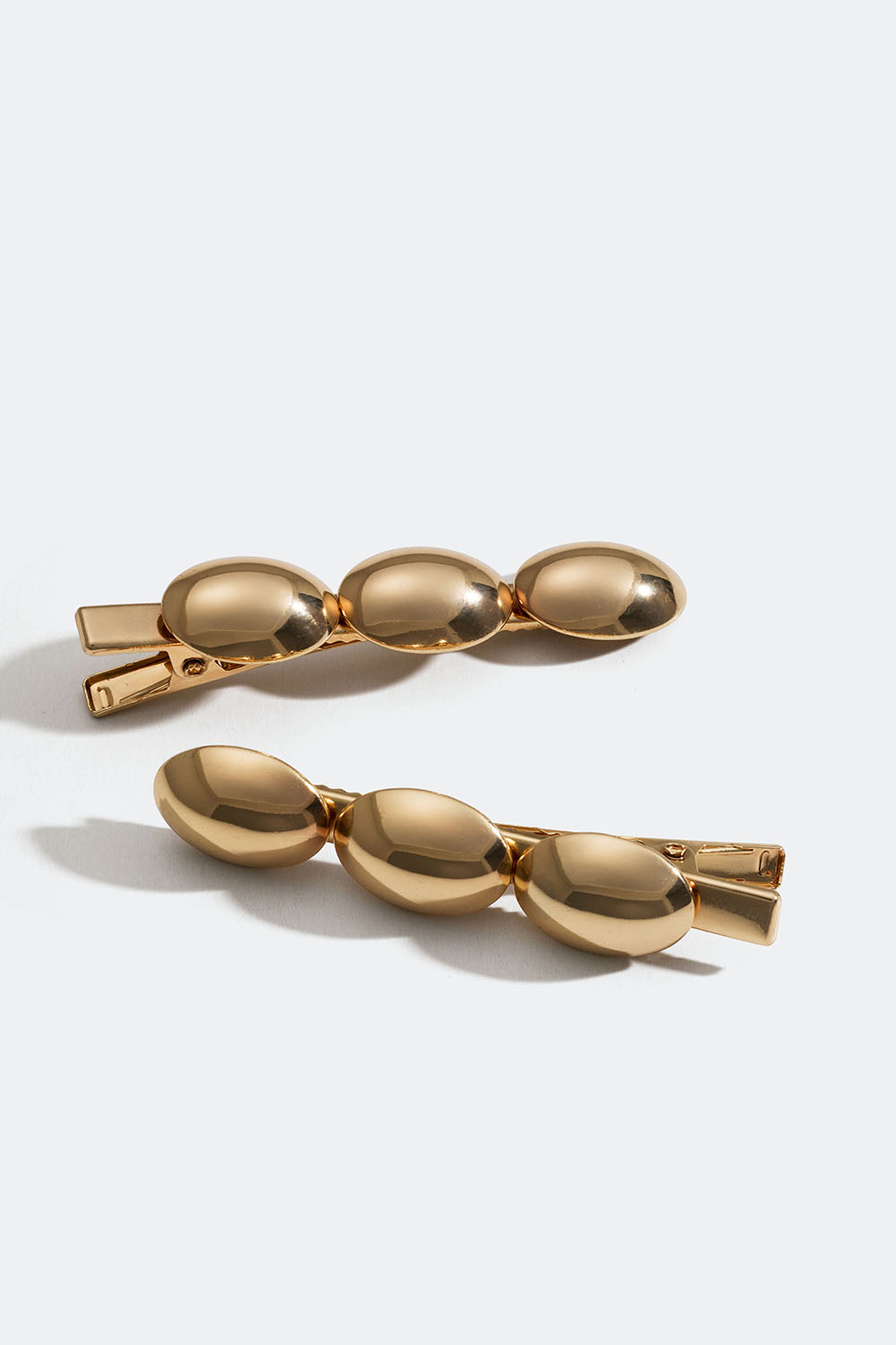 2 kpl nokkaklipsillä varustettua hiusklipsiä, joissa soikeita laattoja. Kullanväristä metallia.