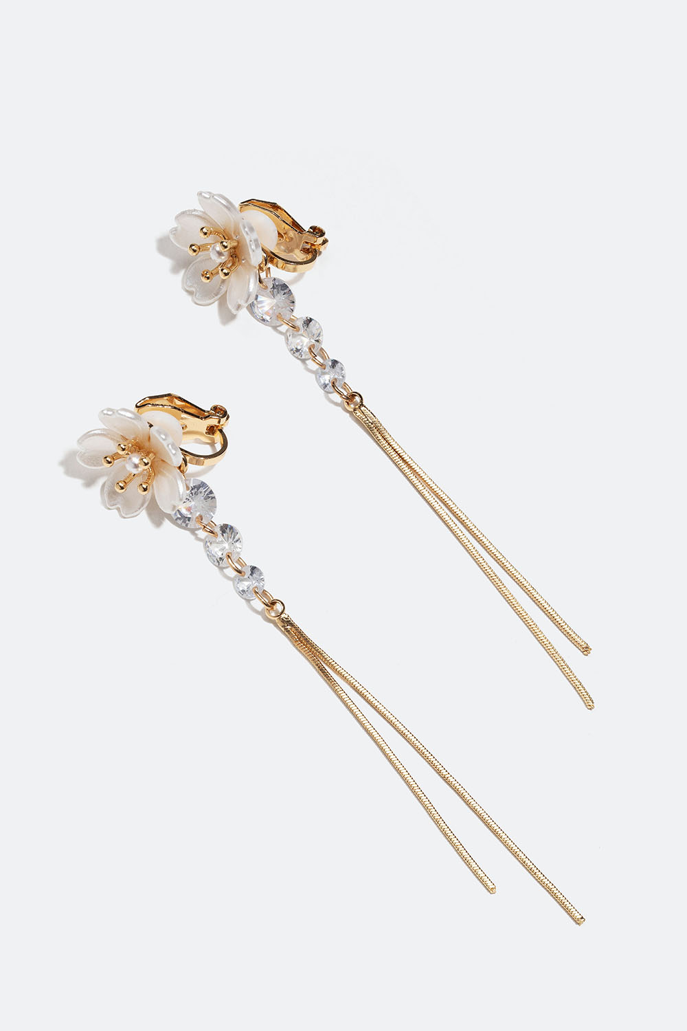 Kullanvärisestä metallista valmistetut klipsikorvakorut, joissa on valkoisia kukkia, lasikiviriipus ja ketjuja. Koristeellinen korvakorupari, joka sopii täydellisesti sinulle, jolla ei ole reikiä korvissa.