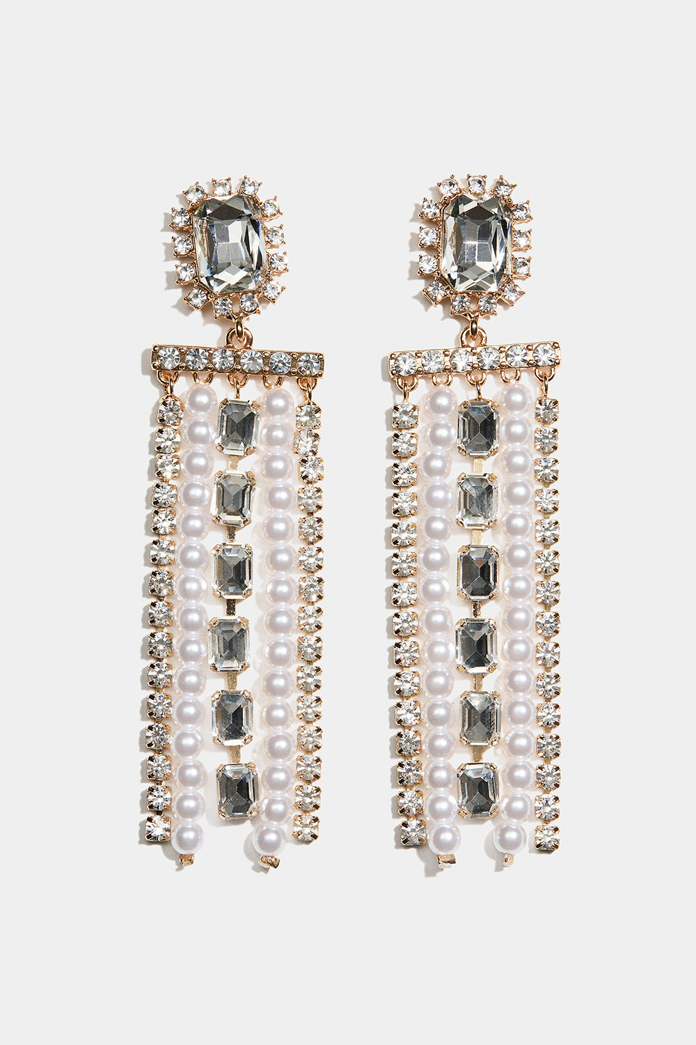 Kullanväriset korvakorut, joissa on suorakulmainen lasikivi ja roikkuivia strassi- ja helmiketjuja ryhmässä Korut / Korvakorut / Strassikorvakorut @ Glitter (253010362002)