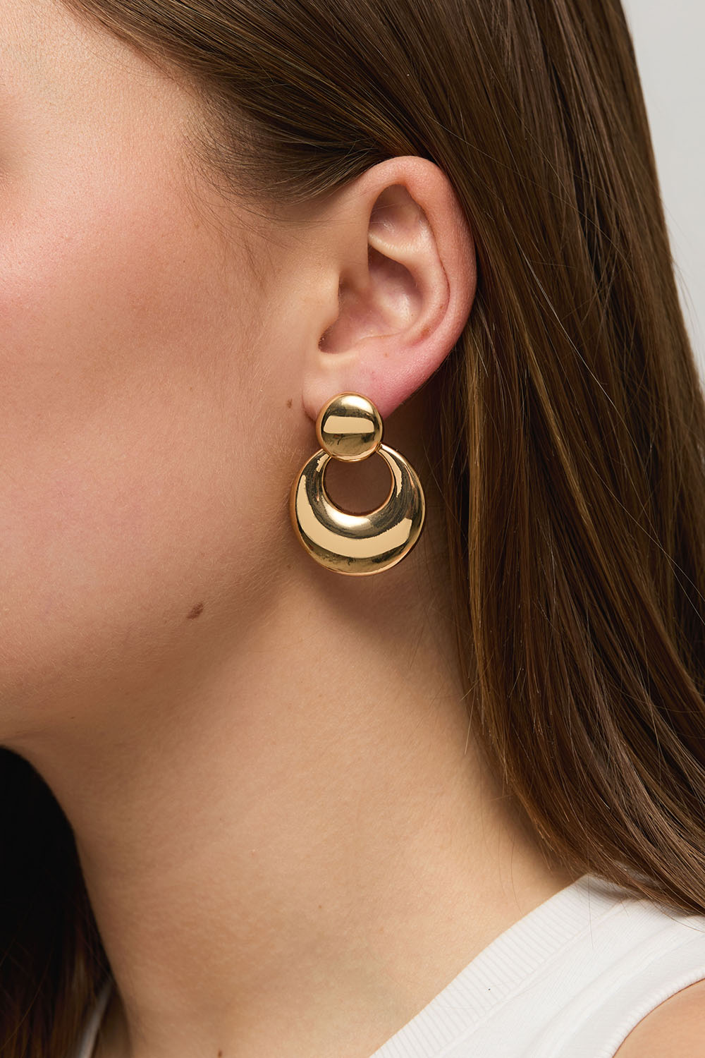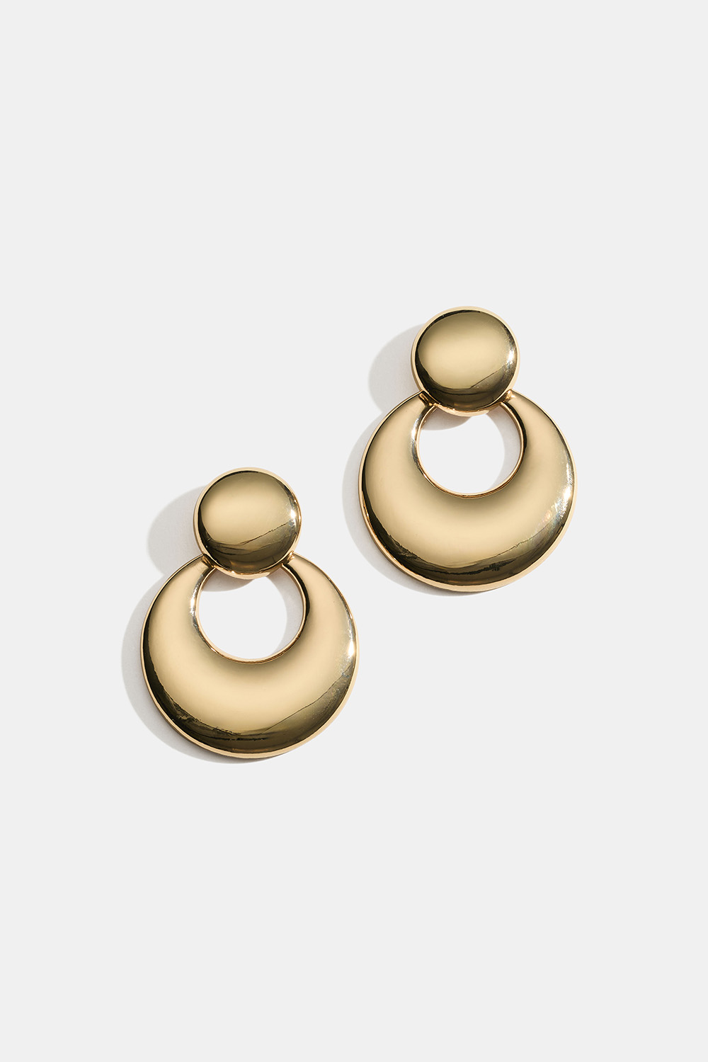 Kullanväriset korvakorut, joissa pyöreitä muotoja