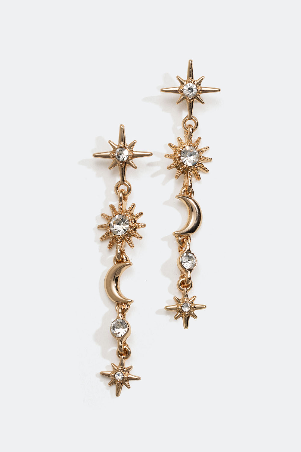 Pitkät kullanväriset metallikorvakorut, joiden riipuksissa on tähtiä, kuita ja pyöreitä lasikiviä.
