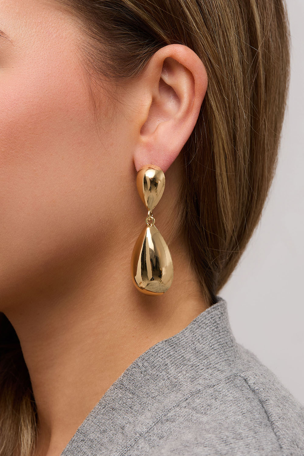 Kullanväriset korvakorut, joissa suuret pisaranmuotoiset riipukset