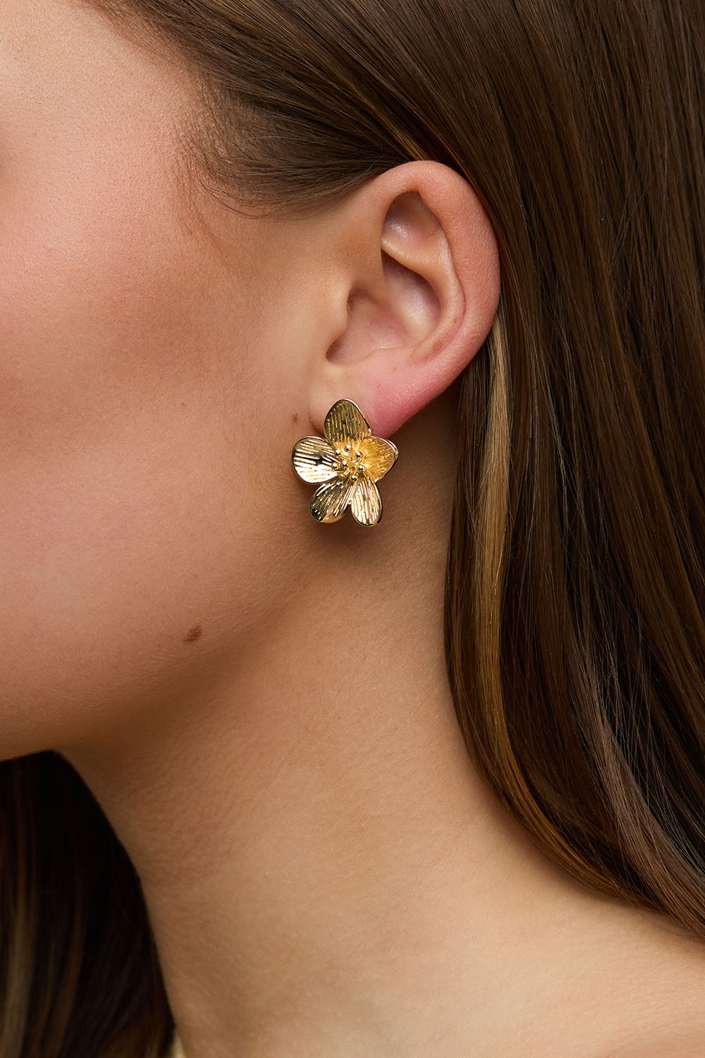 Kullanväriset korvakorut, joissa teksturoituja kukkia