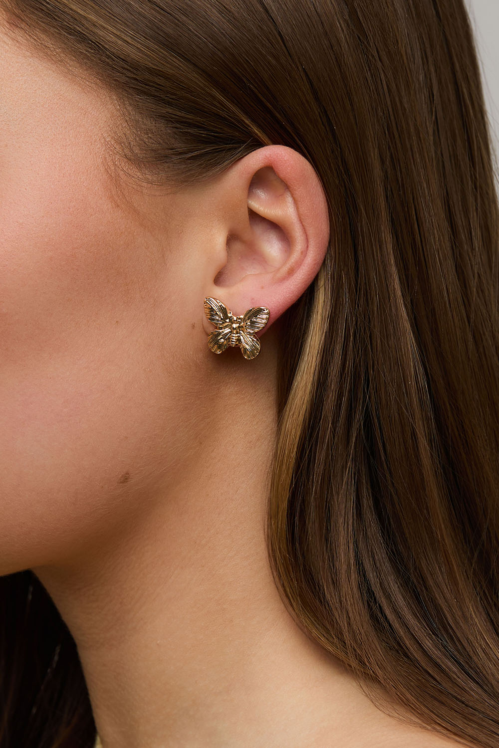 Kullanväriset korvakorut, joissa teksturoituja perhosia