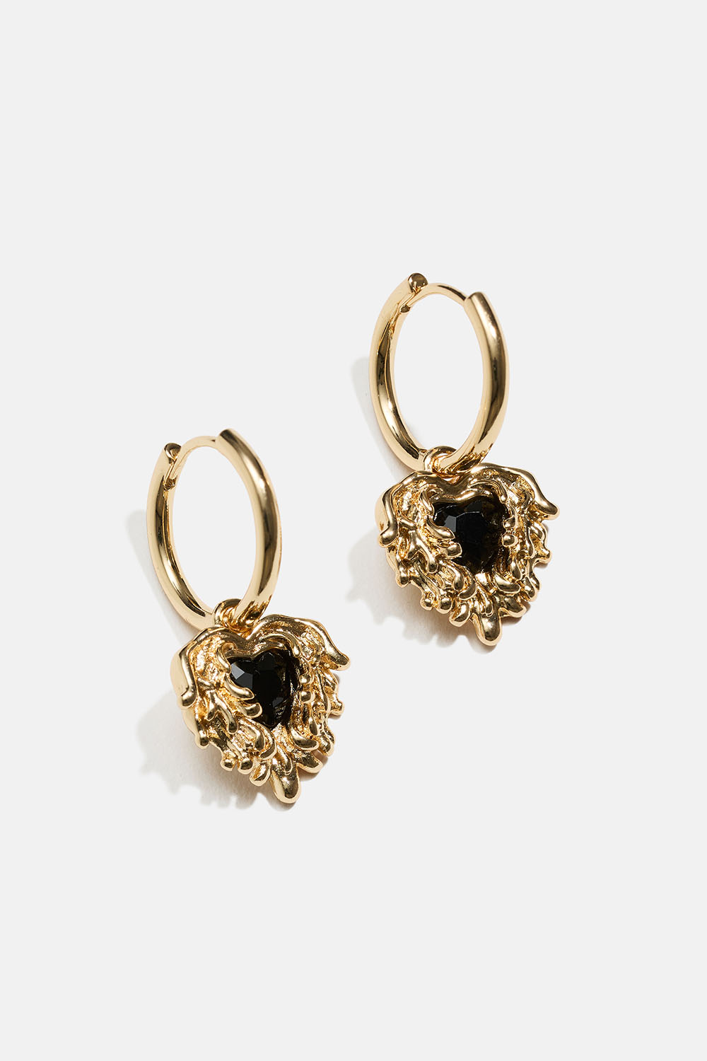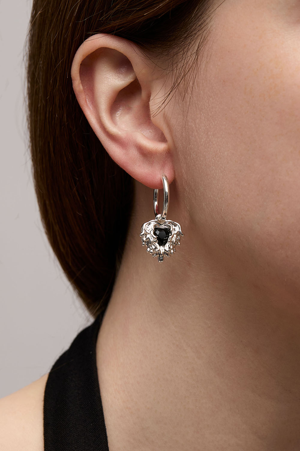 Korvarenkaat, joissa roikkuu valuva sydän ja musta lasikiv.