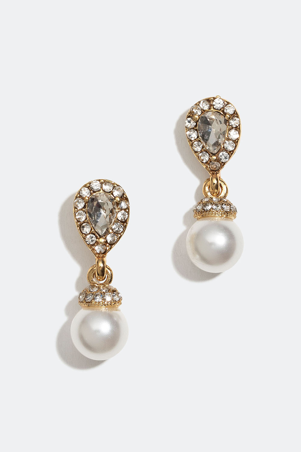 Pisaran muotoiset, kullanvärisestä metallista valmistetut korvakorut, jotka on koristeltu kimaltelevilla lasikivillä ja valkoisilla lasihelmillä.
