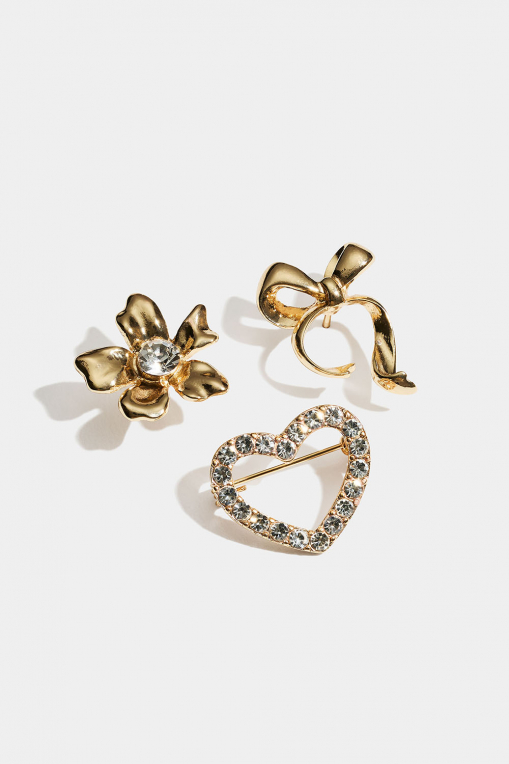 Kullanväriset rintaneulat, joissa on joko rusetti, kukka tai sydän, 3 kpl ryhmässä Korut / Rintaneulat @ Glitter (252000202002)