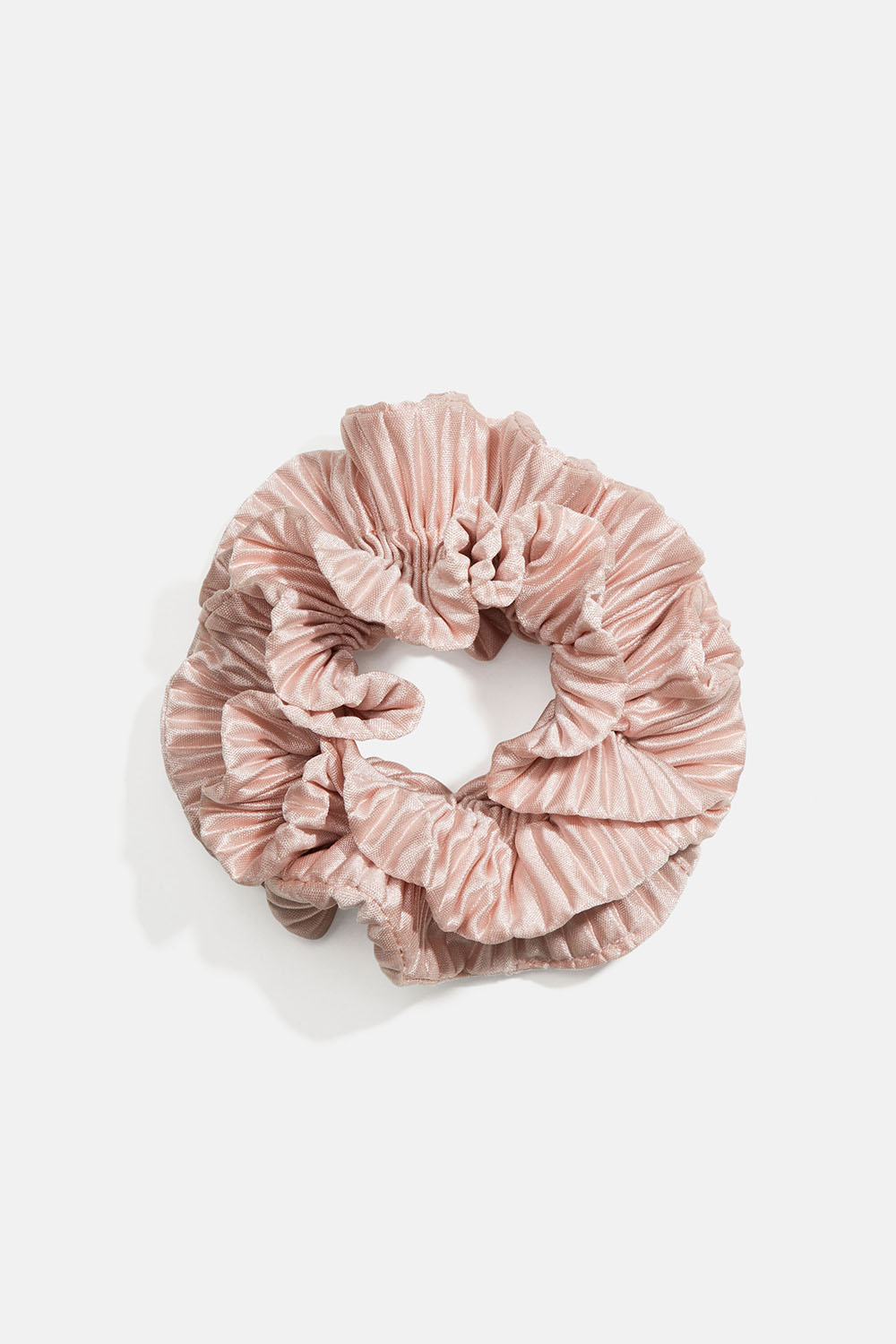 Kiiltävästä vaaleanpunaisesta kankaasta valmistettu pliseerattu hiusdonitsi, jonka kolme koristeellista röyhelöä tekevät siitä ihanan runsaan.