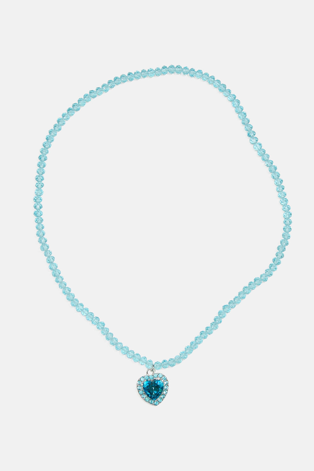 Lasten joustava kaulakoru, jossa on sinisiä lasihelmiä ja lasikivillä koristeltu metallinen sydänriipus.