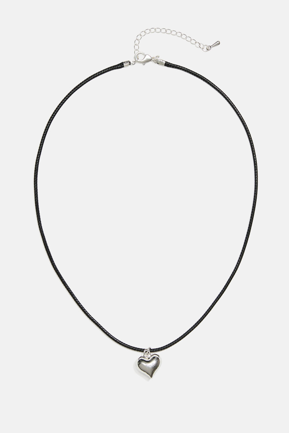 Musta köysikaulakoru lapsille, jossa on hopeanvärinen sydänriipus.