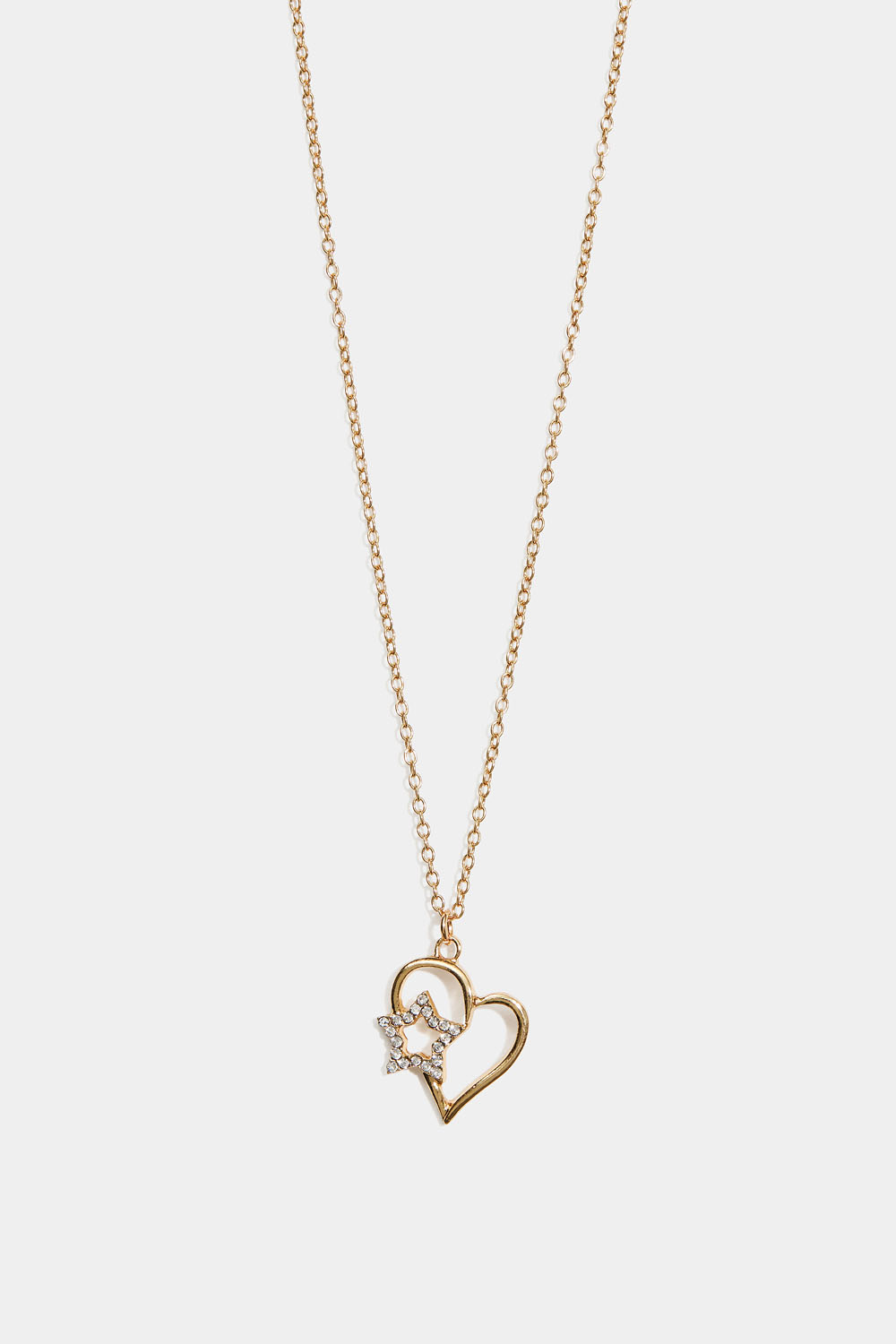 Lasten kullanvärinen metallikaulakoru, jossa on sydänriipus ja lasikivillä koristeltu pieni tähti.