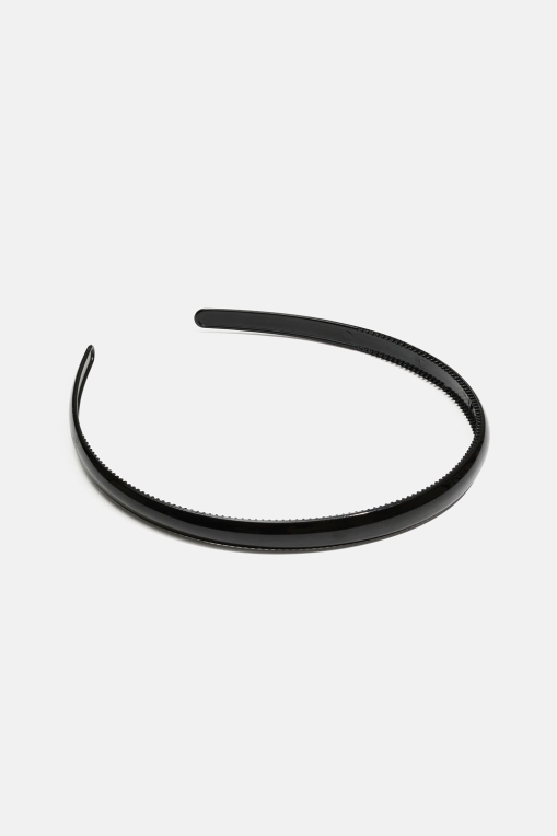 Lasten klassinen hiuspanta kiiltävästä mustasta muovista. Sisäpuolella on pieniä piikkejä, jotka pitävät sen paikallaan.