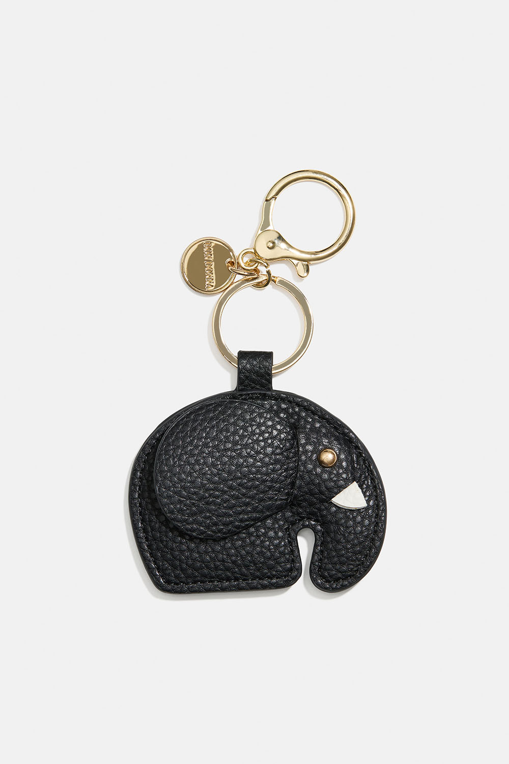 Avaimenperä, jossa on elefantti, mustaa keinonahkaa. Voidaan kiinnittää renkaalla tai korulukolla.