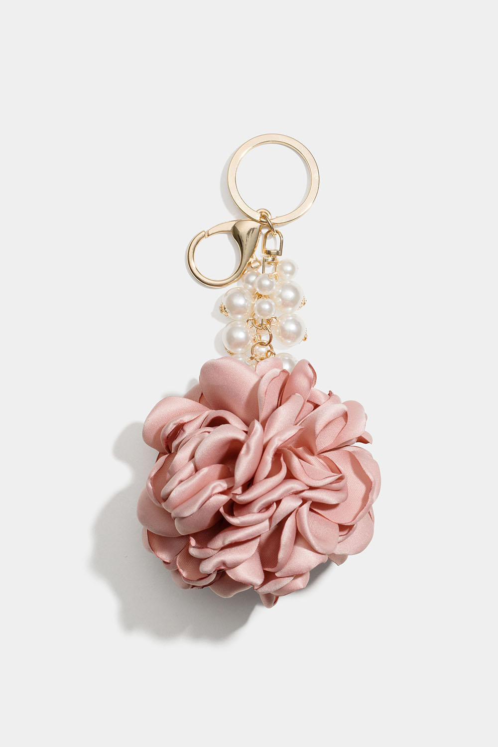 Avaimenperä, jossa on valkoisia helmiä ja suuri vaaleanpunainen kangaskukka. Voidaan kiinnittää avainrenkaalla tai korulukolla