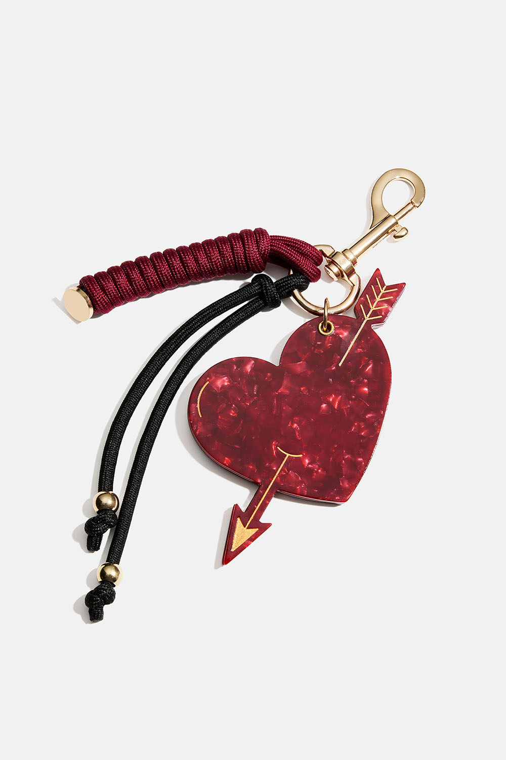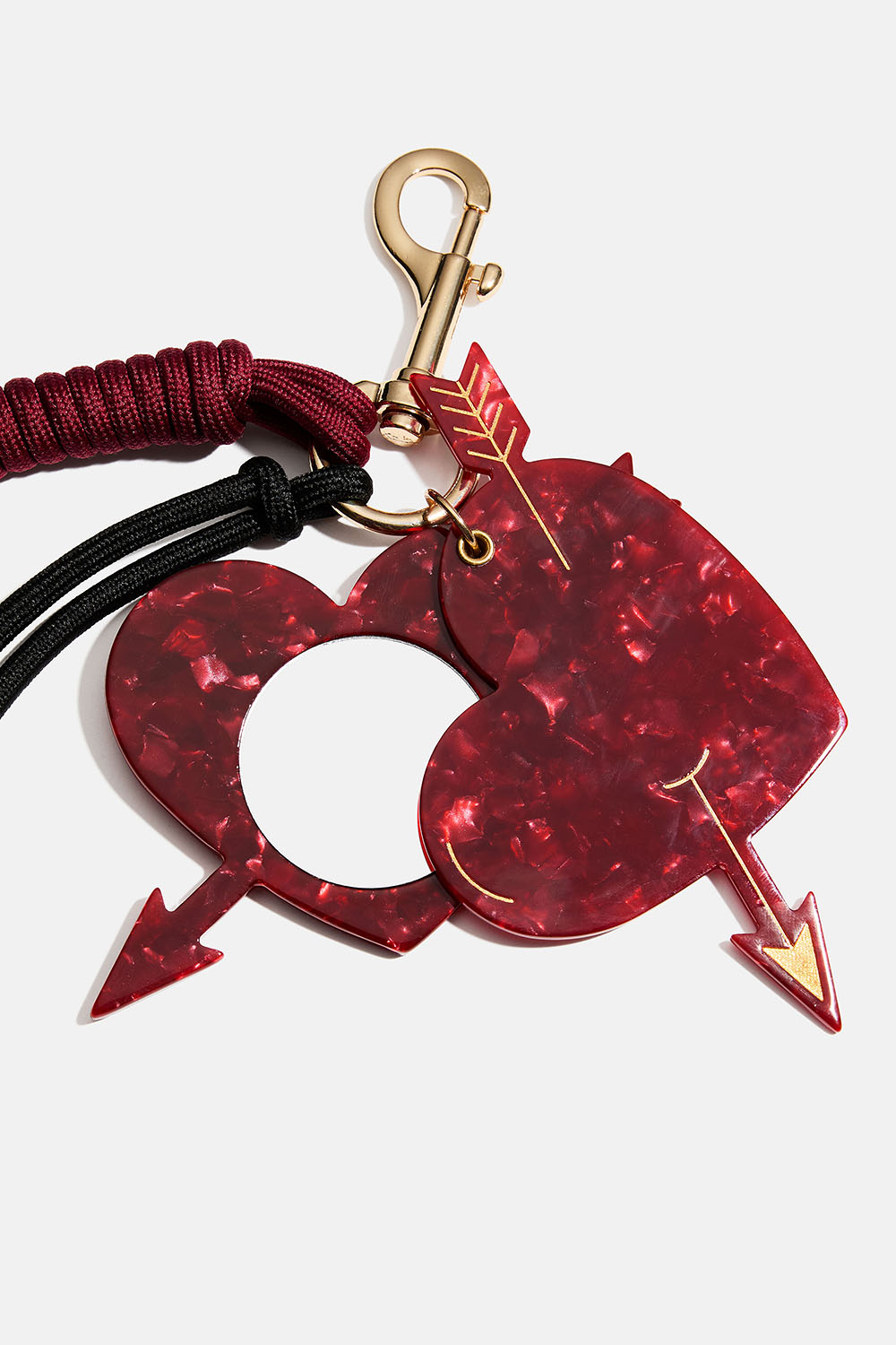 Laukkukoriste, jossa on suuri punainen sydän pienellä peilillä sekä koristenaruja. Voidaan kiinnittää renkaalla tai korulukolla.