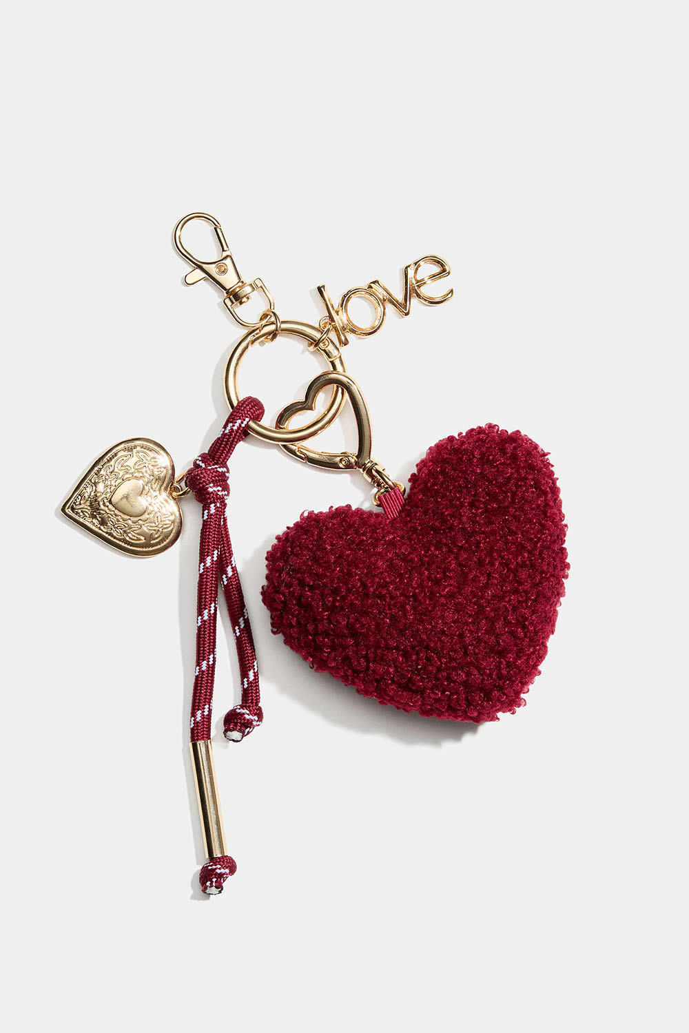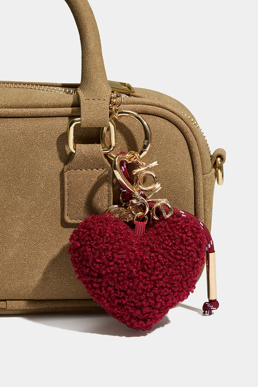 Avaimenperä, jossa on pörröinen tummanpunainen sydän, köysi ja riipus. Voidaan kiinnittää renkaalla tai korulukolla.