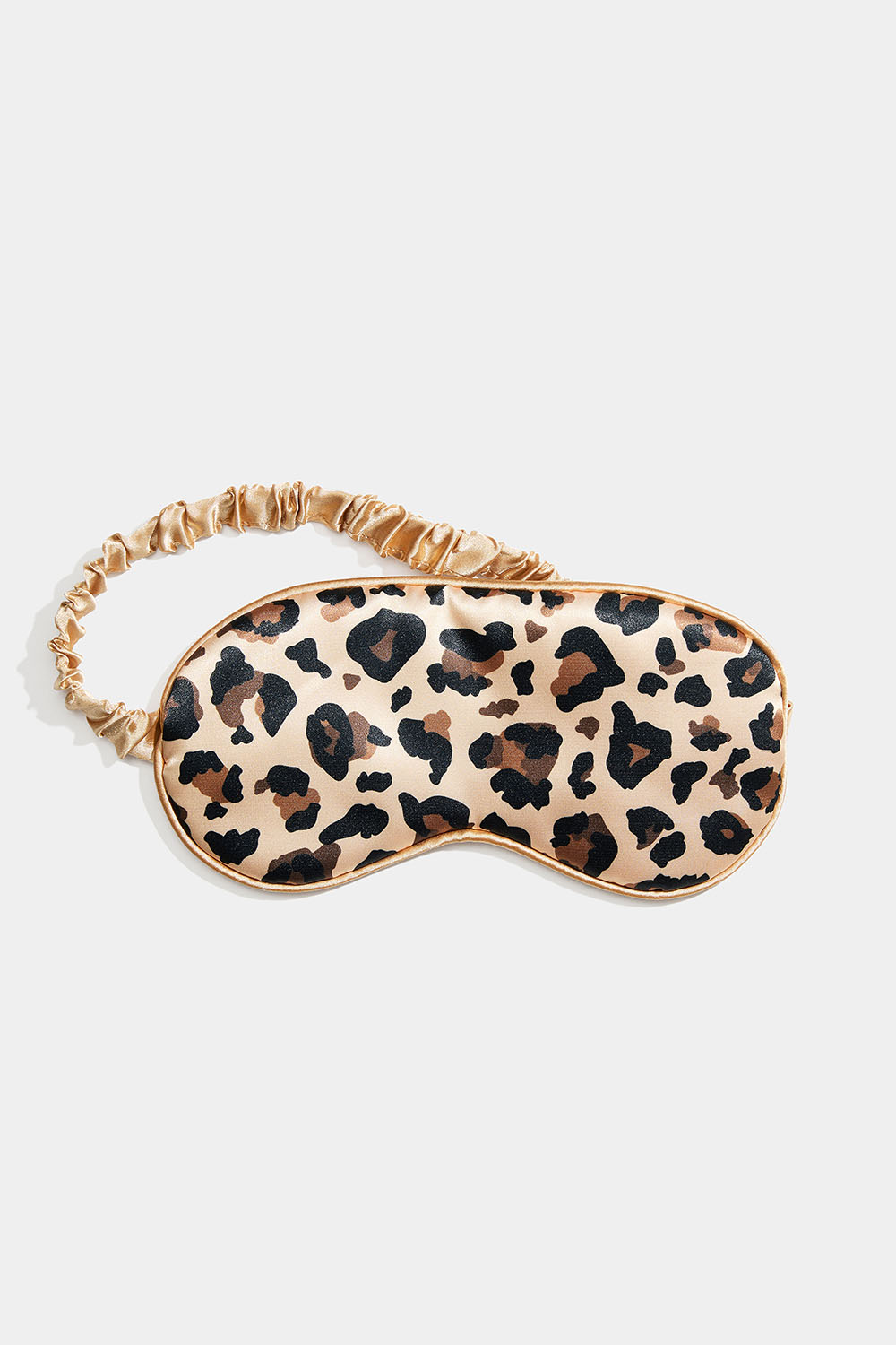 Kevyesti pehmustettu leopardikuvioinen satiininen unimaski, jossa on joustava nauha pitämään maski paikoillaan.