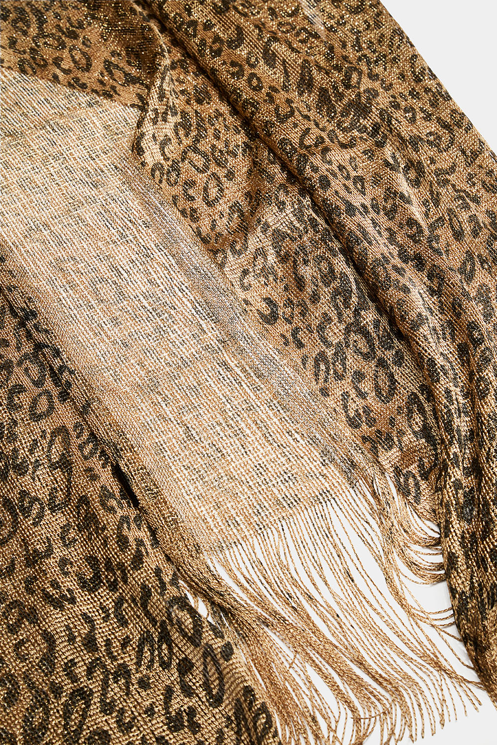Kesäinen ohut leopardikuvioinen poncho/peite, jonka alaosassa on hapsut.