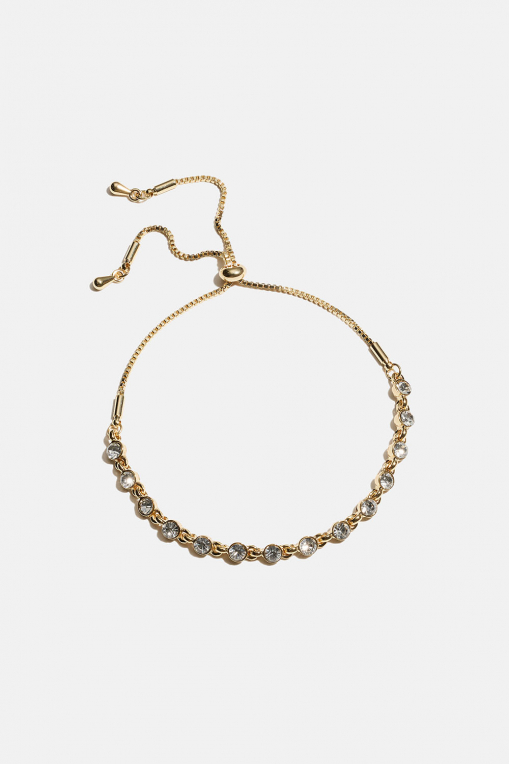 Kullanvärinen metallirannekoru, jonka ohut ketju on koristeltu pienillä pyöreillä lasikivillä. Ketjun pituus on säädettävissä kumilla päällystetyn kultahelmen avulla.