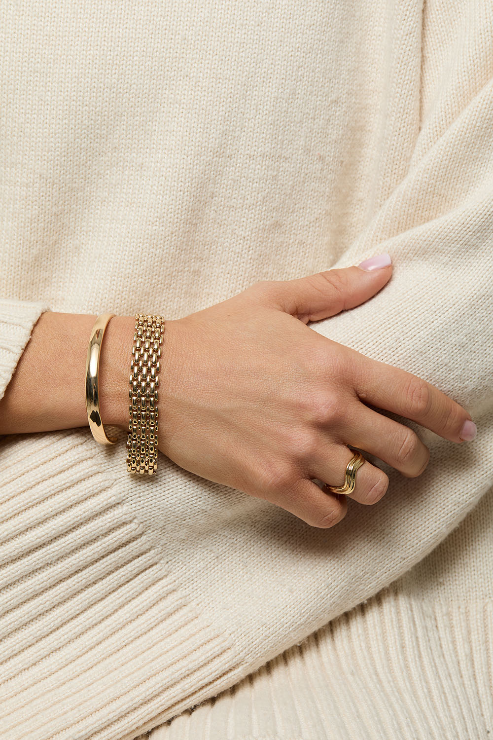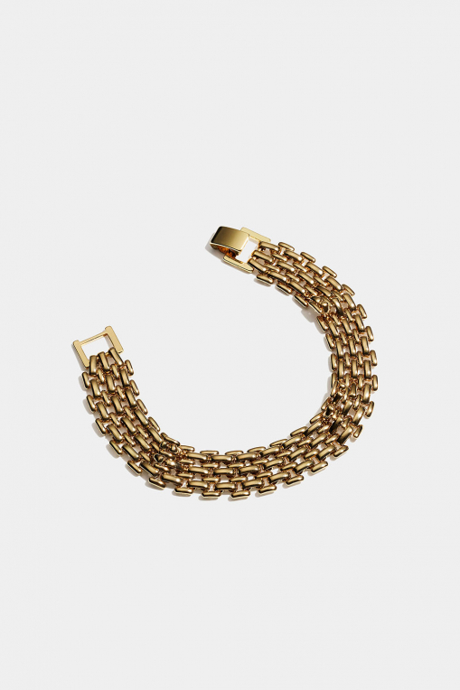 Leveä kullanvärinen rannekoru, jossa tiivis ketju