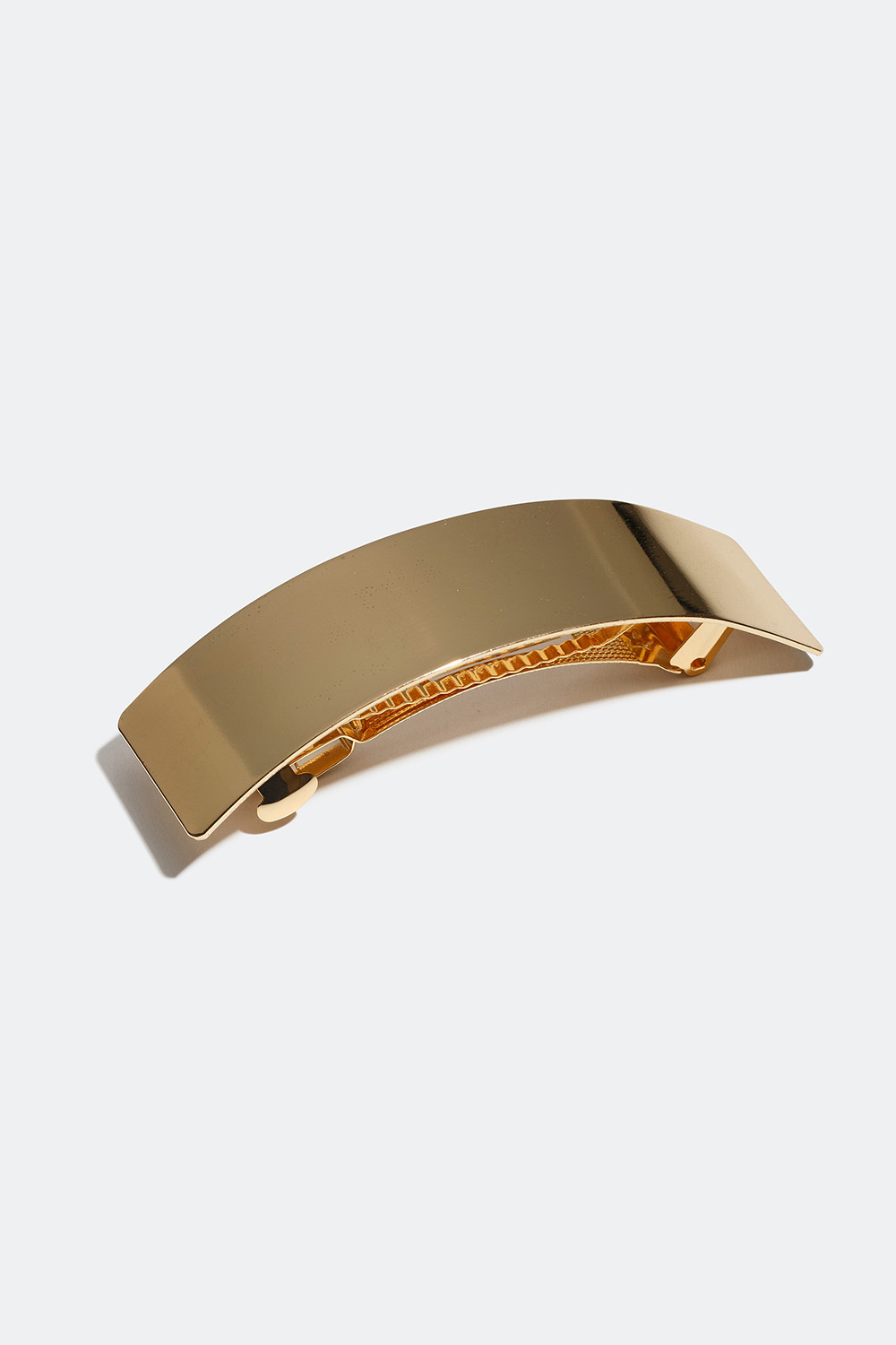 Leveä hiussolki, jossa on suorakulmainen laatta, joka on valmistettu kiiltävästä metallista ja jossa on pieni kaarre. Yksinkertainen ja joustava hiusasuste, jossa tyylikäs design ja joka sopii kaikkiin tilanteisiin. Toimii täydellisesti sekä puoliksi tai kokonaan ylös nostetuissa kampauksissa.