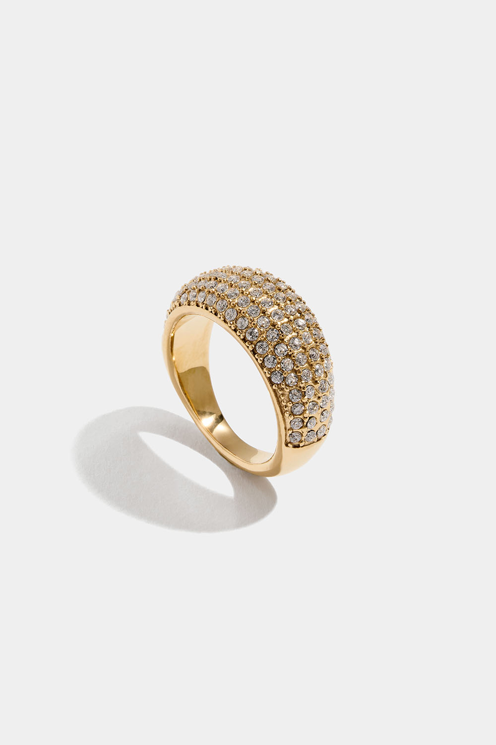 Korkeakiiltoisesta, ruostumattomasta teräksestä valmistettu leveä sormus, joka on PDV-pinnoitettu 18k kullalla ja jonka pinta on peitetty pienillä Cubic zirkonia -kivillä.