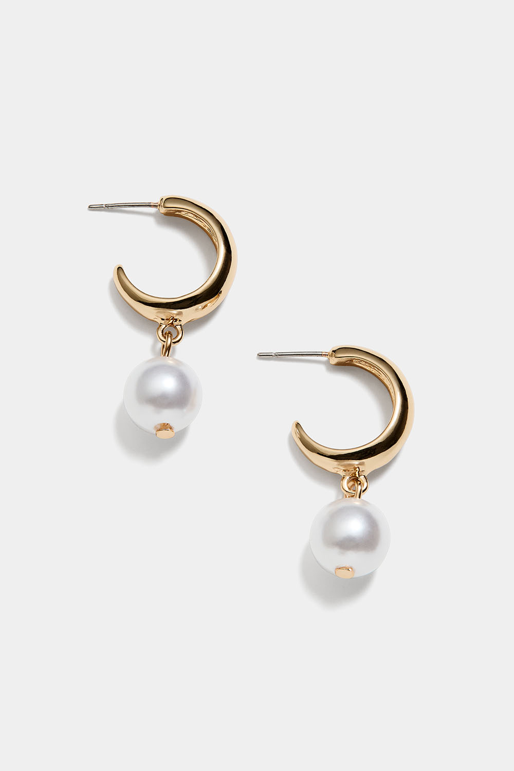 Leveät kullanväriset metallikorvarenkaat, jossa on valkoinen helmiriipus.