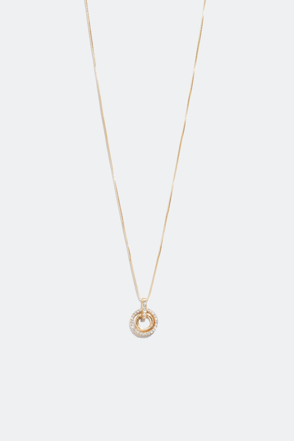 Lyhyt kaulakoru ohuella ketjulla ja riipuksella missä kaksi starrikivin koristeltua yhdessäistuvaa rengasta. Saatavilla hopean- ja kullanvärisenä.