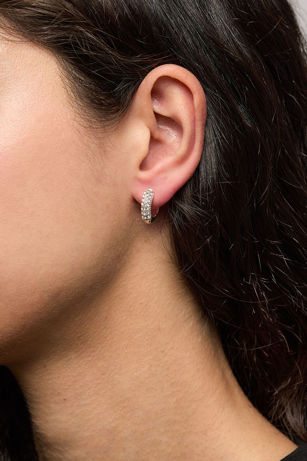 Leveät, hopeanvärisestä metallista valmistetut minikorvarenkaat, joiden etuosassa on kolme riviä valkoisia strassikiviä.
