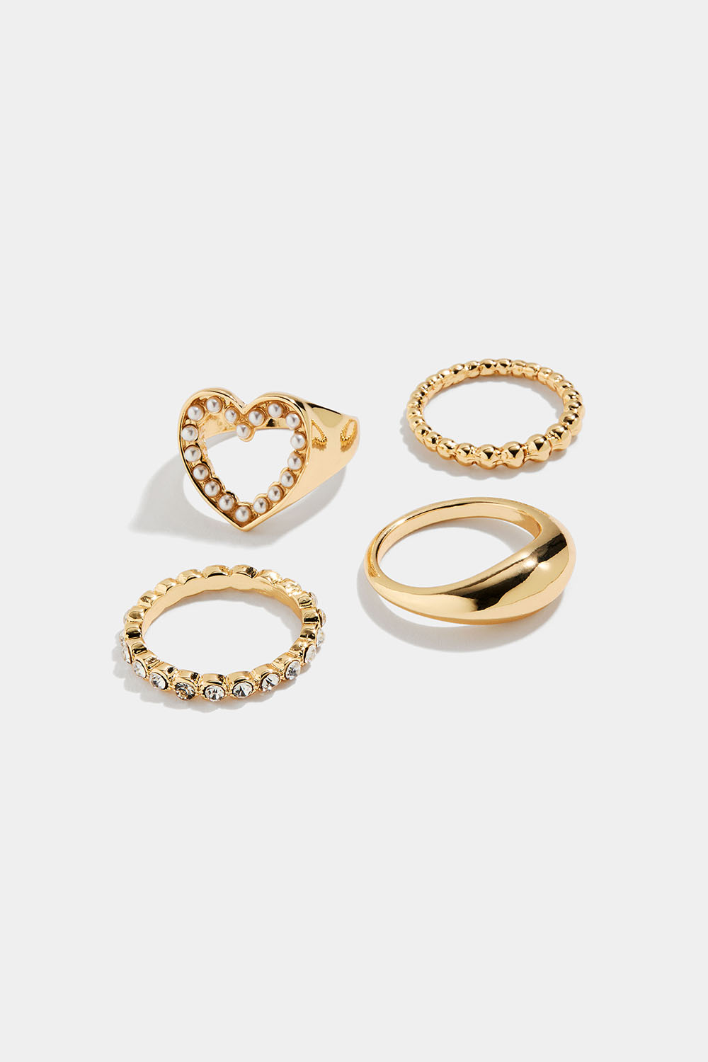 Monipakkaus sormuksia, joista yhdessä on ontto helmisydän, yksi on päällystetty lasikivillä, yksi on muodoltaan kupera, ja yhdessä on kaksi toisiinsa kiinnitettyä palloa. Kaikki kullanväristä metallia.