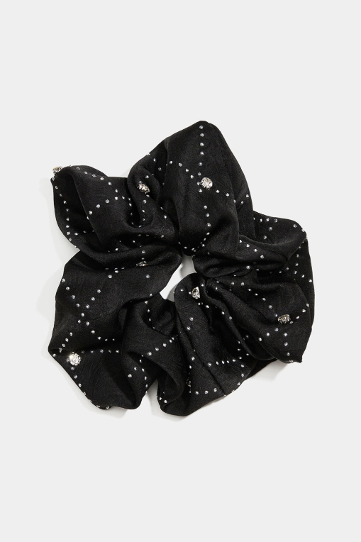 Suuri, kiiltävästä mustasta kankaasta valmistettu hiusdonitsi, jossa on pieniä niittejä ja valkoisia kiviä.