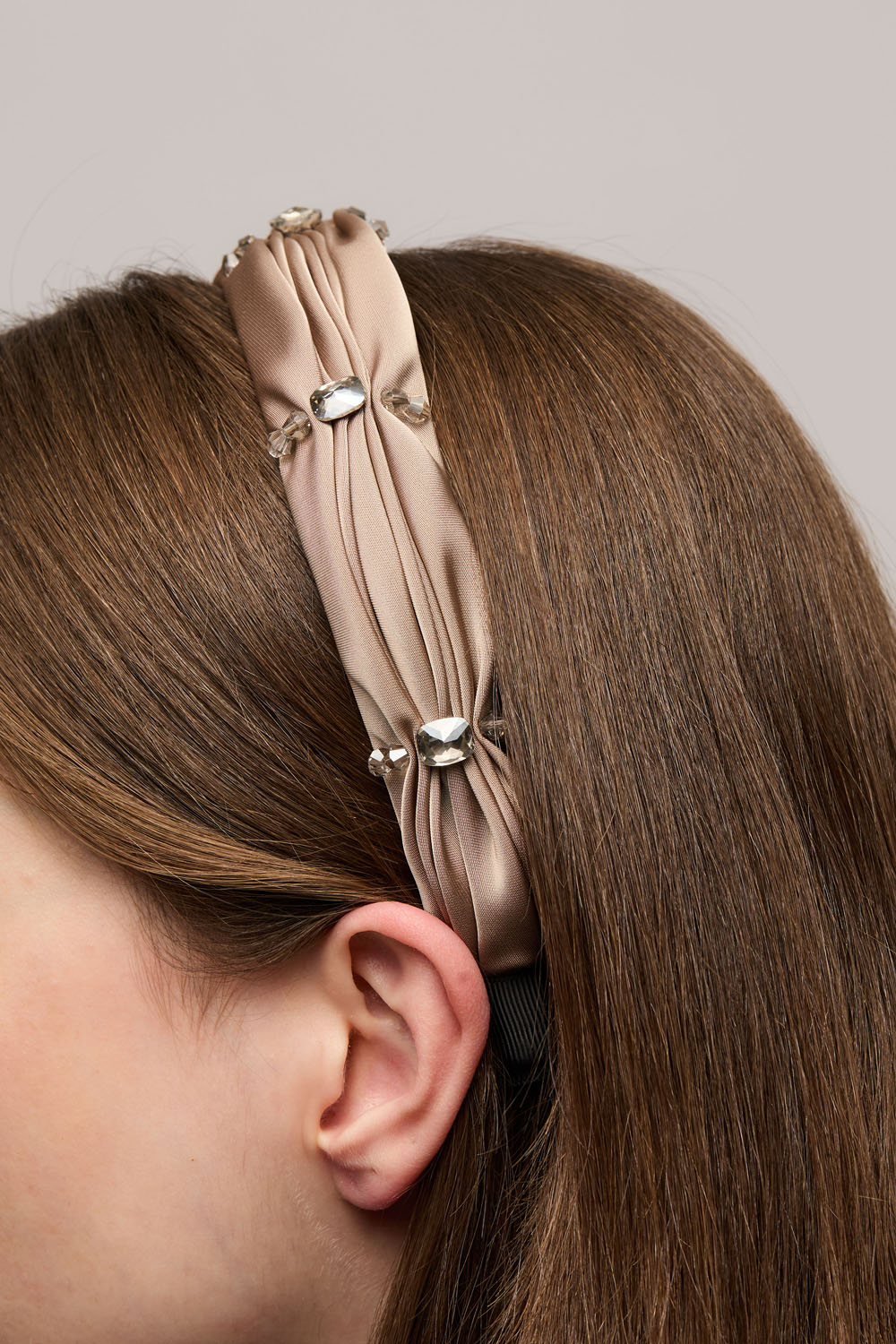 Hiuspanta mustaa rypytettyä kangasta koristeltuna läpinäkyvillä helmillä.