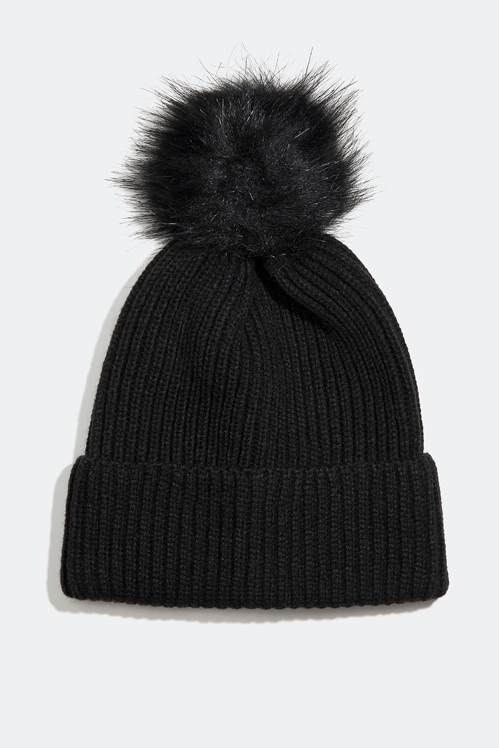 Musta joustinneulepipo, jossa on taitettu reuna ja pörröinen pallo tupsuna. Lämmittävä ja muotokieleltään klassinen asuste, joka sopii useisiin sesonkeihin ja on täydellinen asuste viileämpinä päivinä.