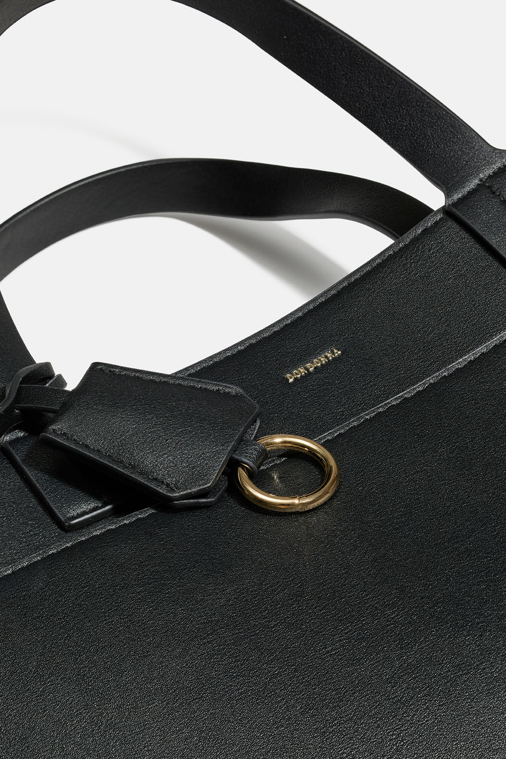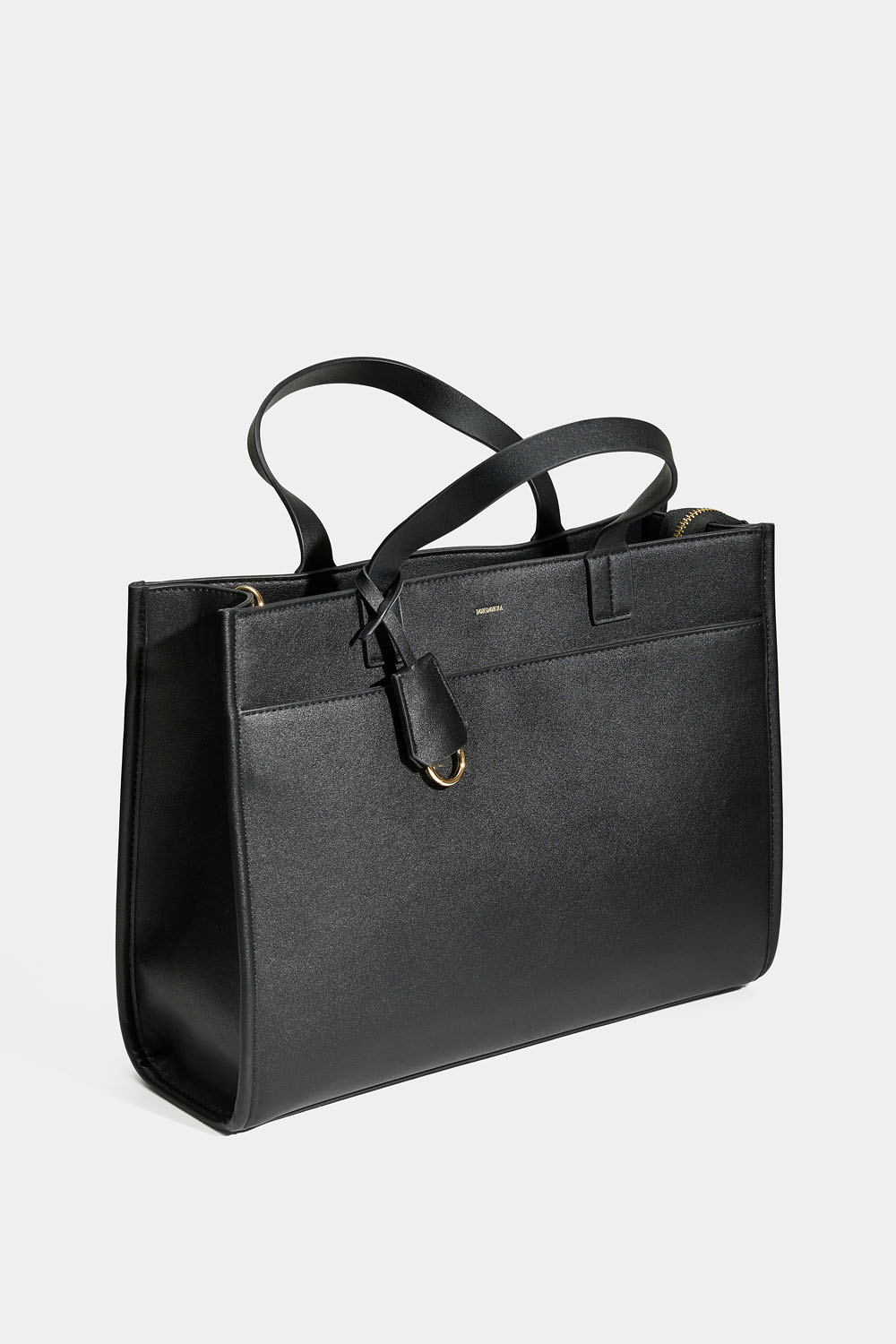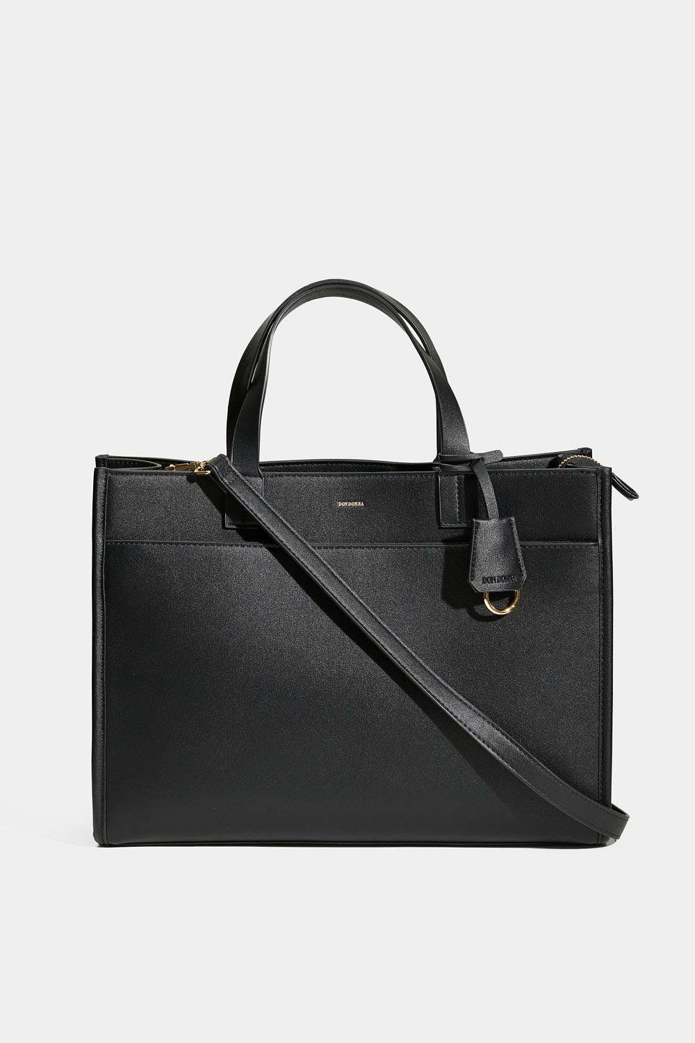 Musta suorakulmainen käsilaukku keinonahasta. Laukussa on vetoketju, tuplakahvat ja olkahihna, avaimenperä, pieni vetoketjullinen tasku, sivutasku sekä sisälokero kannettavaa tietokonetta varten. Tietokonelokeroon mahtuu 14-tuumainen tietokone, joka vastaa 33 x 23 cm:n kokoa.