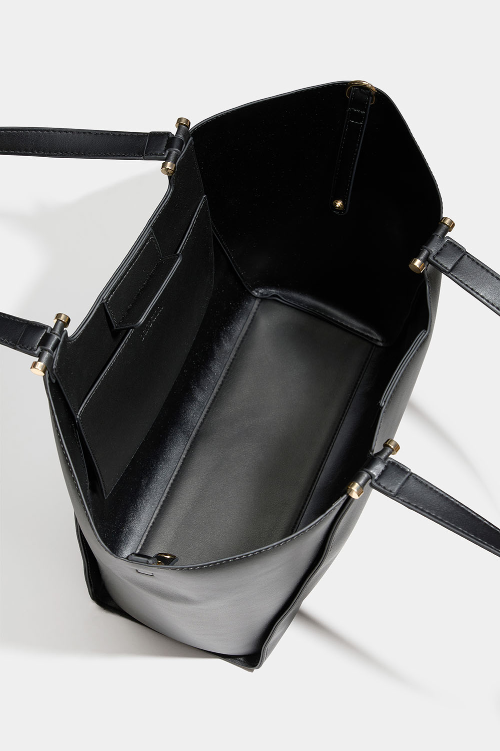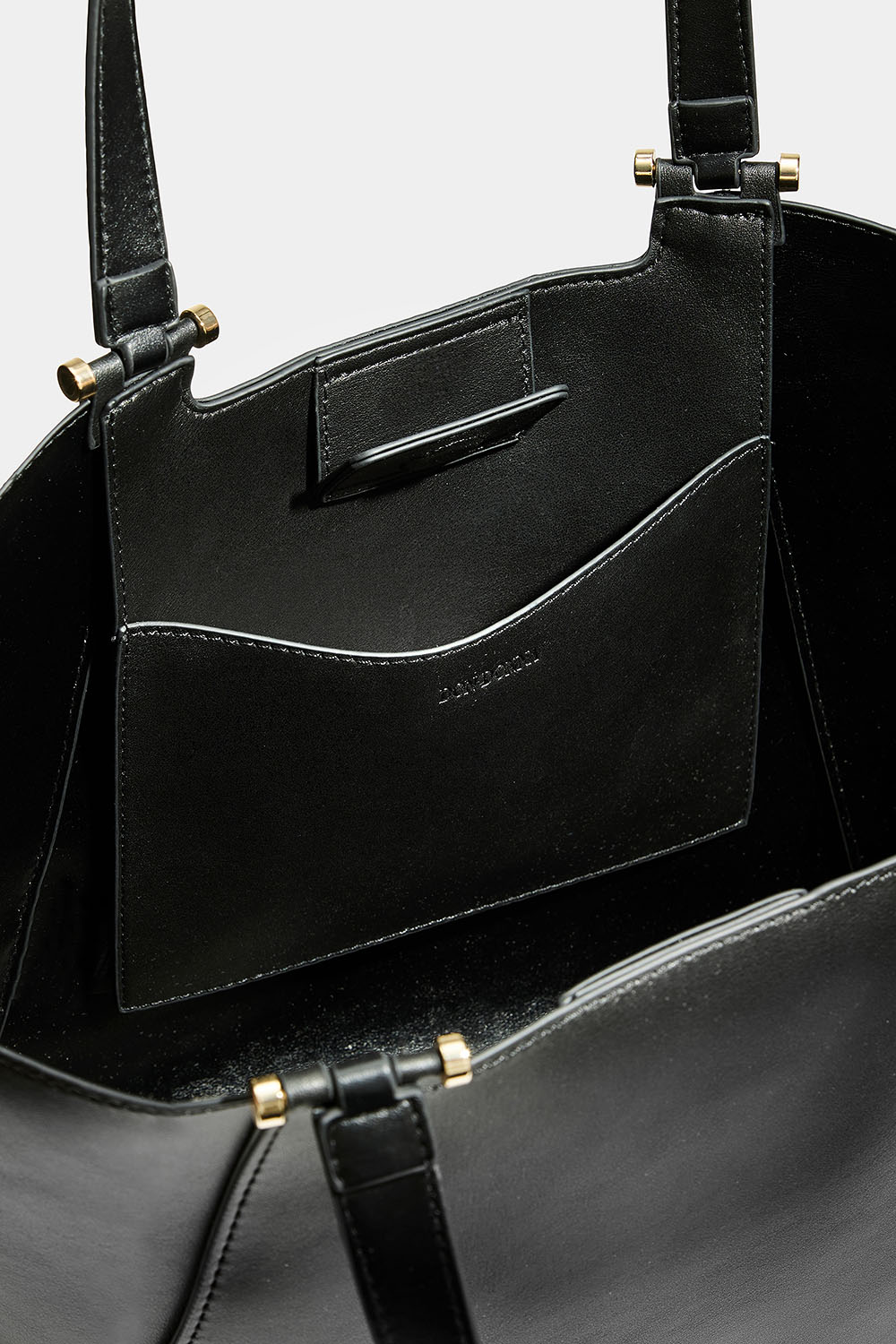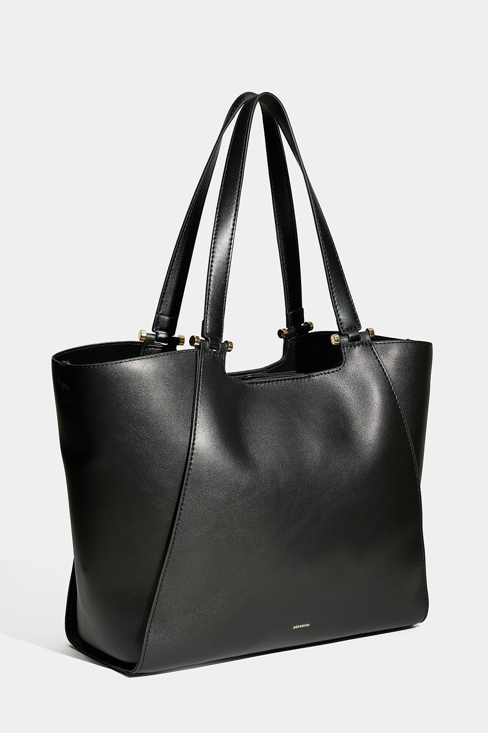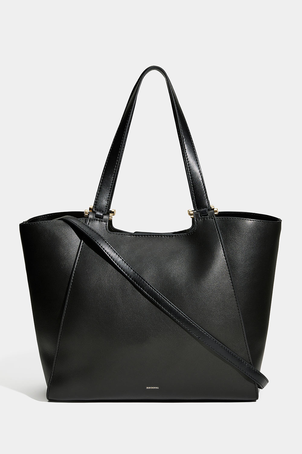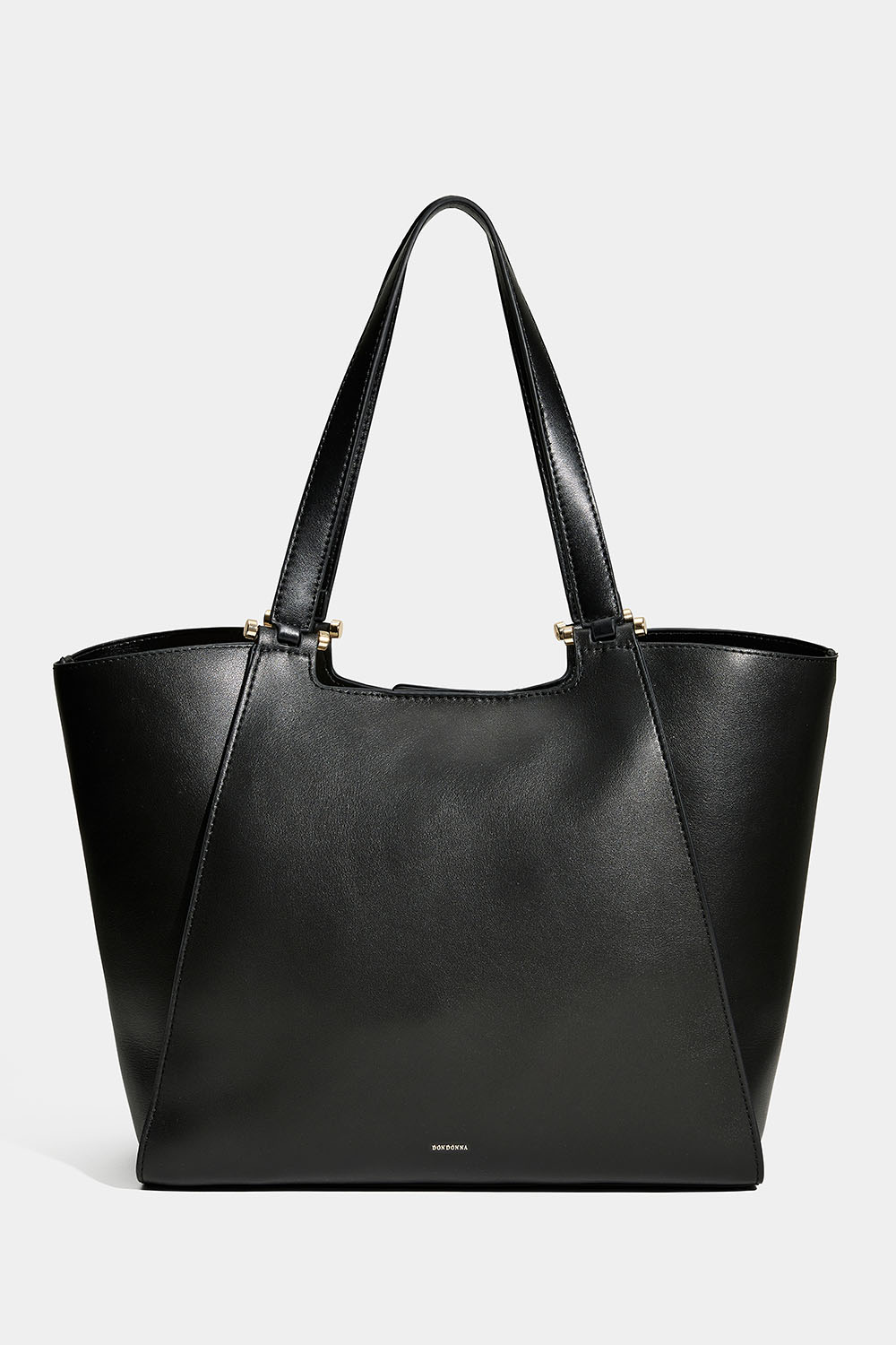 Musta Don donna -kassi keinonahasta. Tyylikäs laukku, jossa on kaksinkertaiset kapeat kahvat ja irrotettava pidempi olkahihna. Laukussa on suuri lokero, joten voit halutessasi napittaa laukun sivut kapeammiksi.