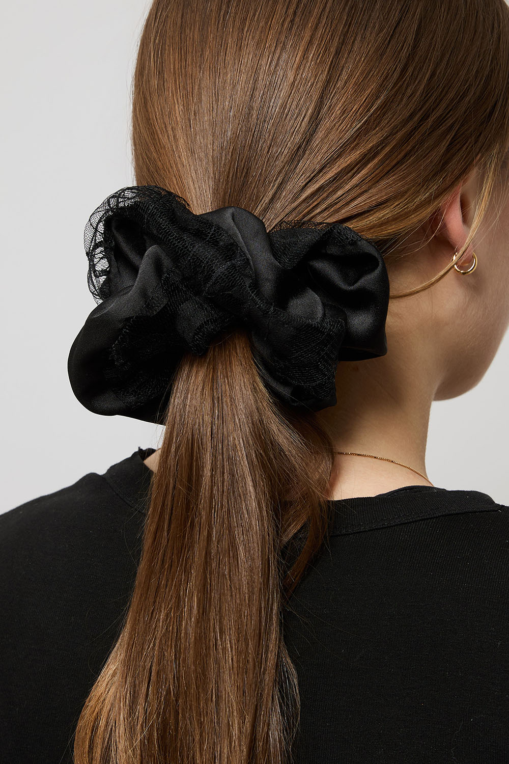 Musta keinosilkistä valmistettu hiusdonitsi pitsikoristeella ryhmässä Hiustuotteet / Scrunchie-hiusdonitsit @ Glitter (332002029000)
