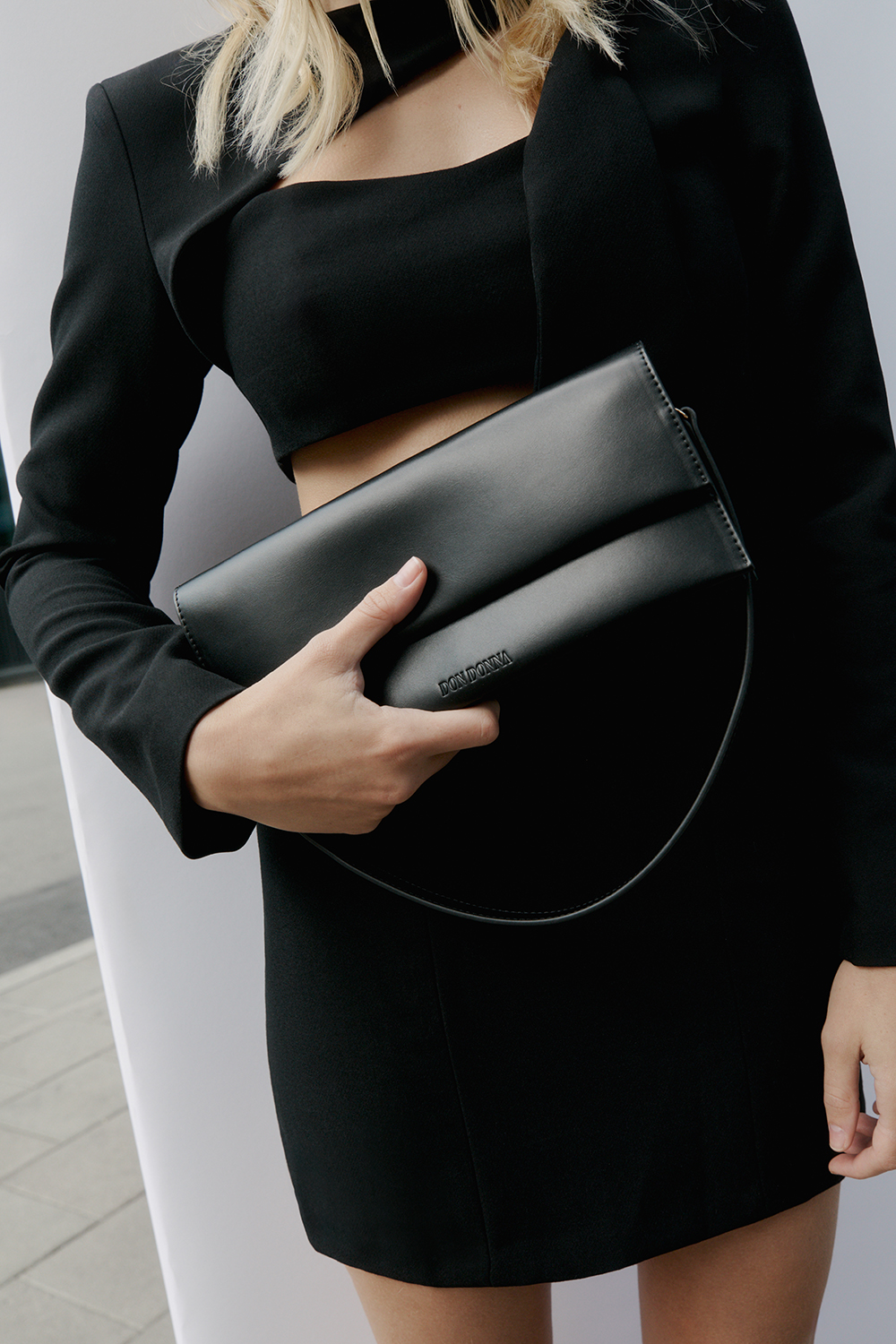 Musta tekonahkainen kirjekuorilaukku, jossa on kohokuvioitu pieni Don Donna -logo. Laukku voidaan sulkea magneettinapilla, ja siinä on kolme sisätaskua, jotka voi sulkea vetoketjulla. Mukana on irrotettava olkahihna.