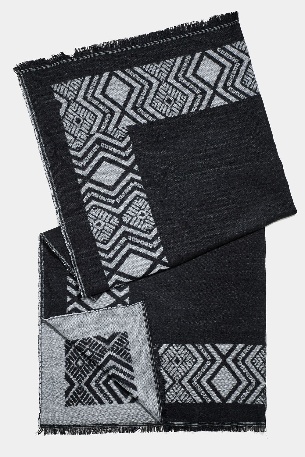 Musta poncho harmaalla kuviolla ja hapsuilla.