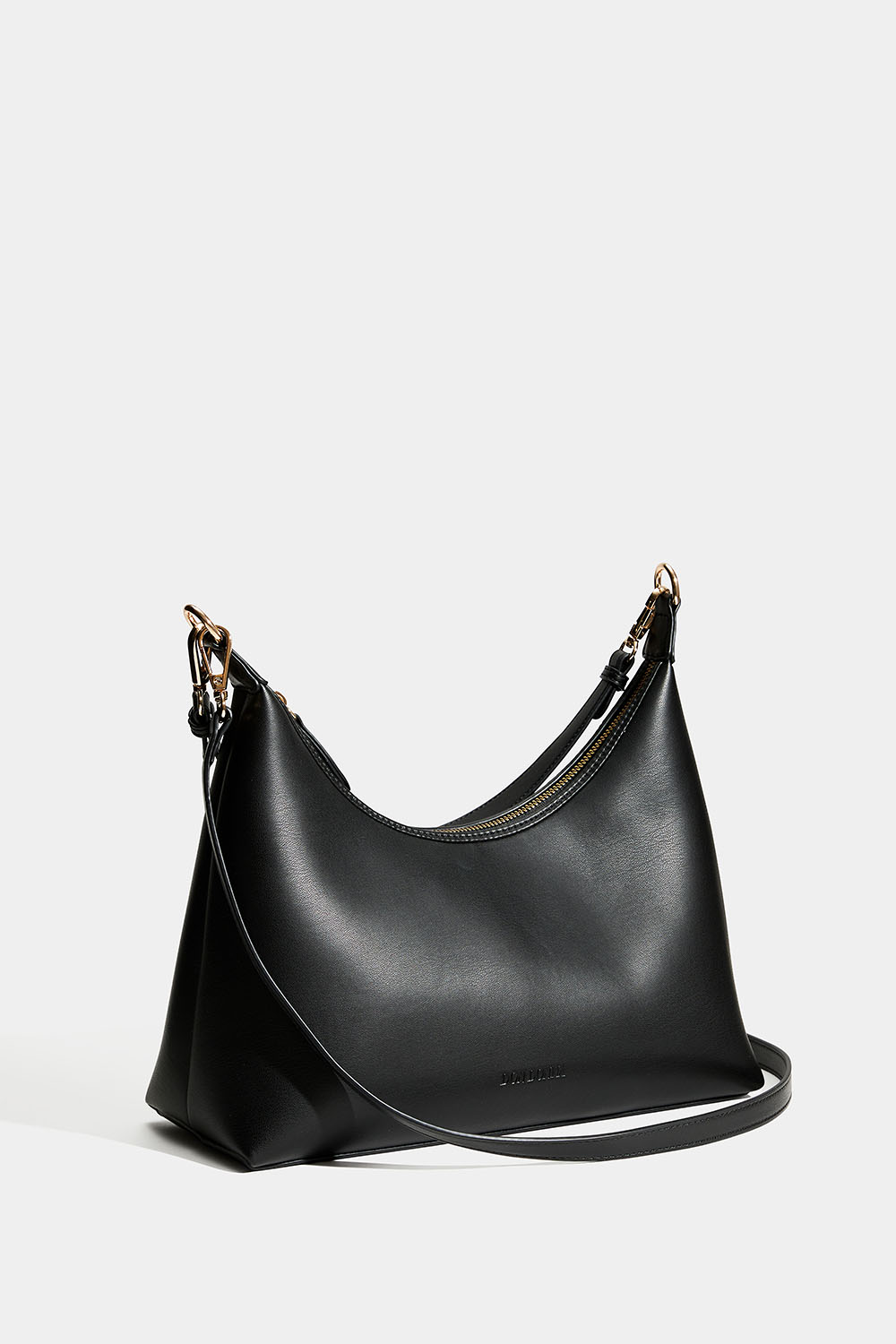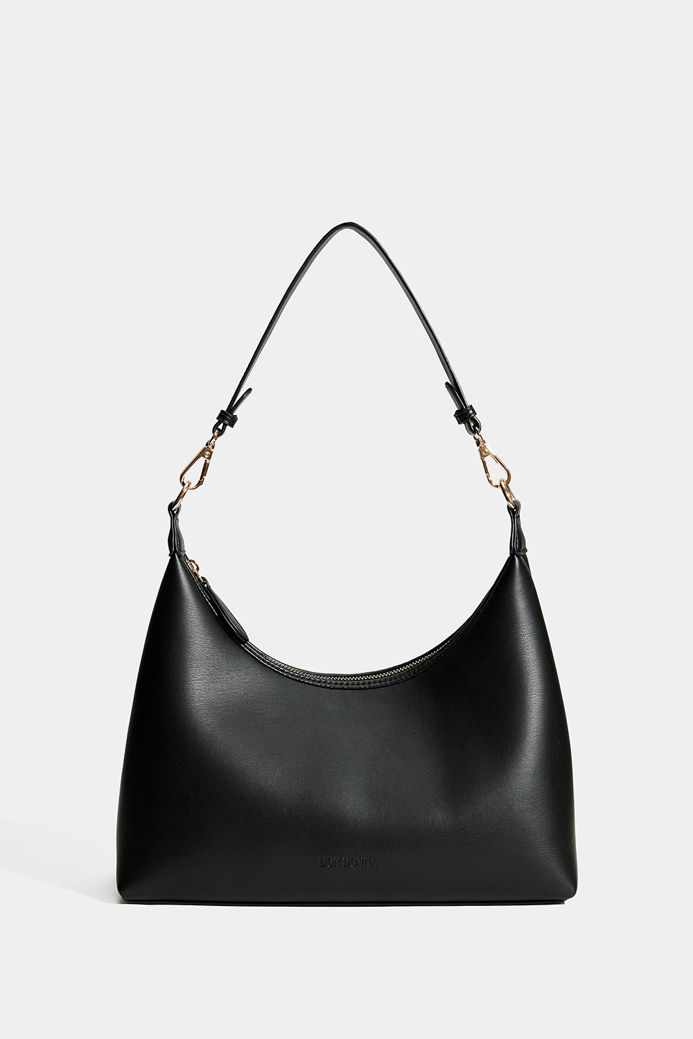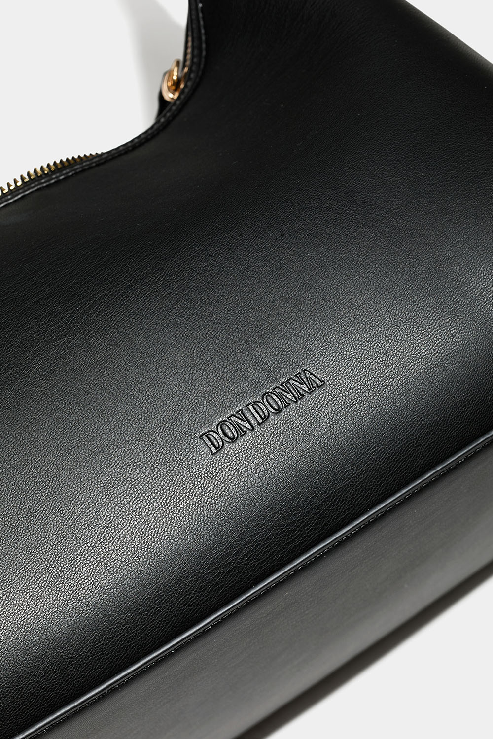 Ajaton musta Don Donnan keinonahkainen olkalaukku, jonka etupuolelle on kohokuvioitu Don Donna-logo. Päätasku suljetaan kultaisella vetoketjulla, ja sisällä on myös pienempi tasku. Laukussa on irrotettava olkahihna ja mukana tulee pidempi säädettävä olkahihna, joten voit vaihtaa olkahihnan ja käyttää laukkua crossbody-laukkuna.