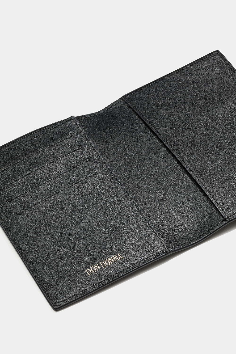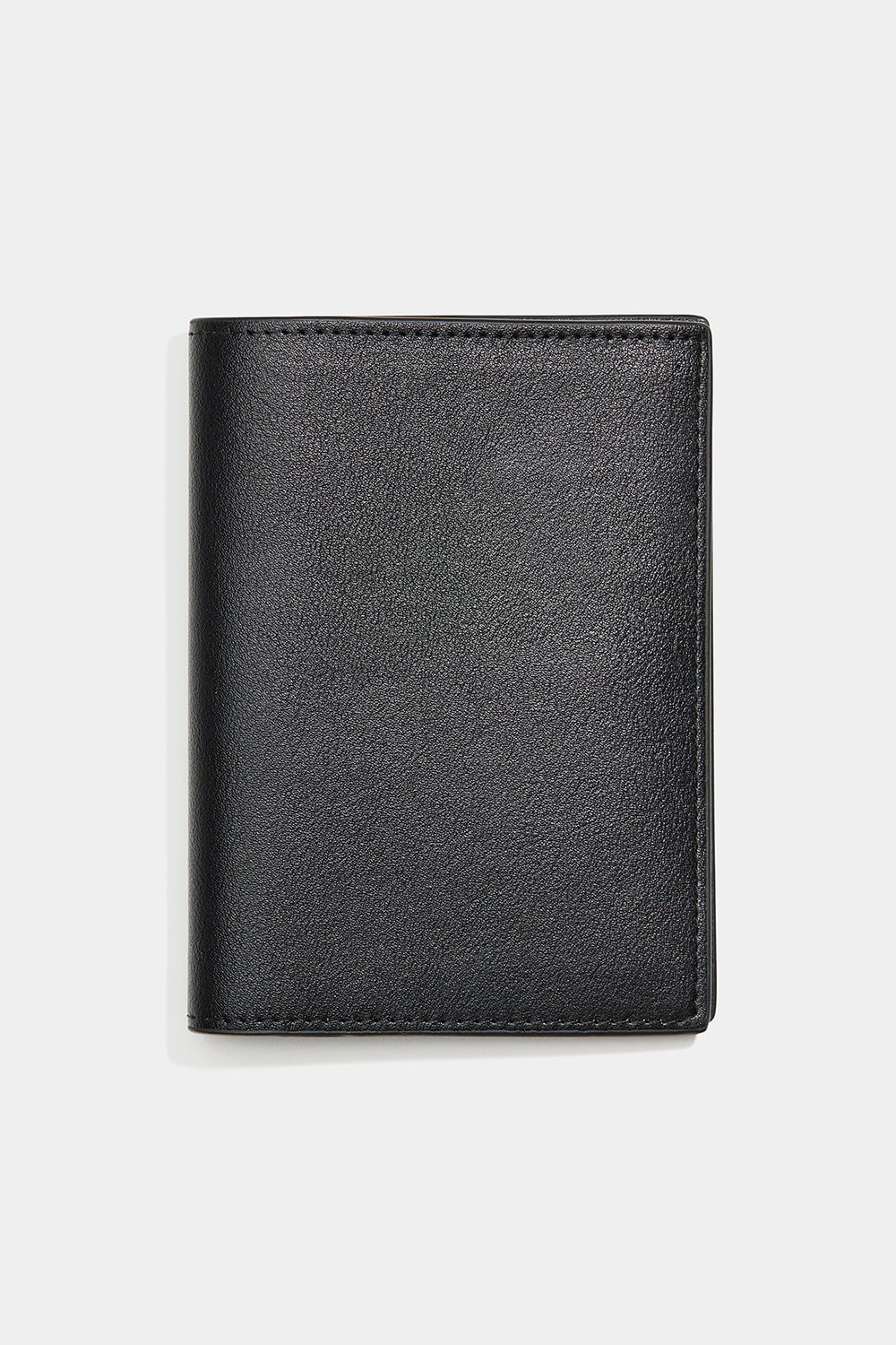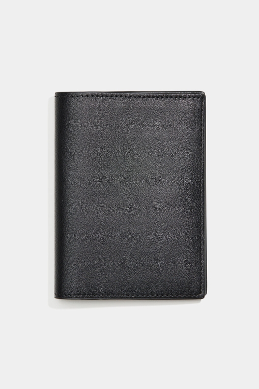 Musta passikotelo keinonahkaa. Sisäpuolella on myös neljä korttipaikkaa.