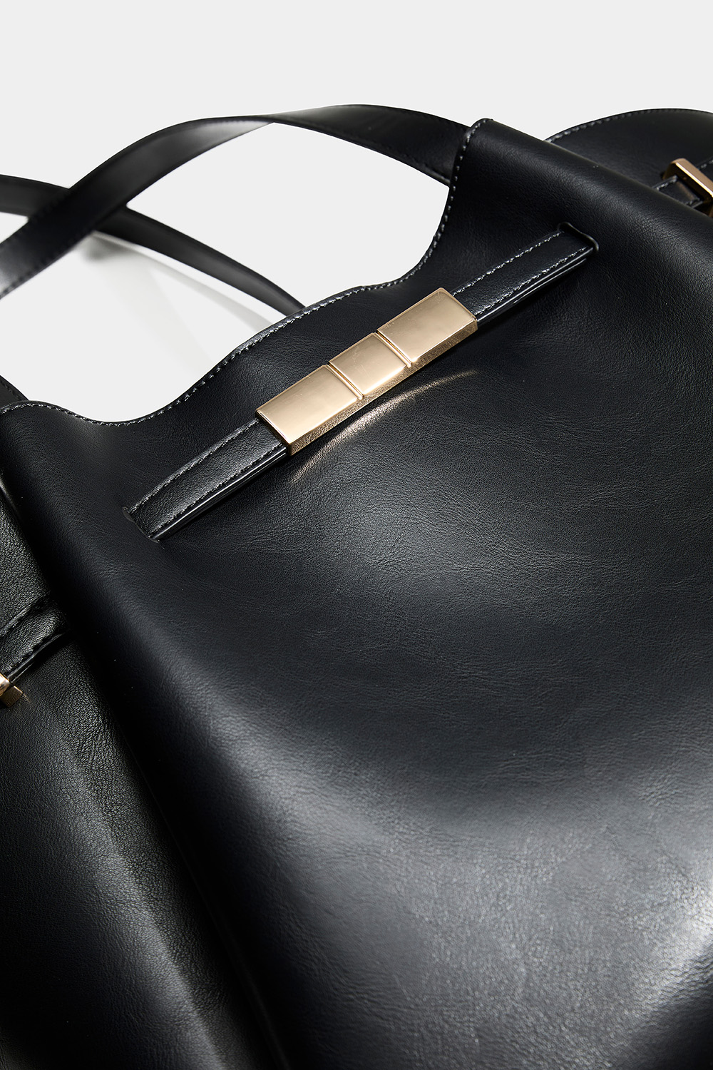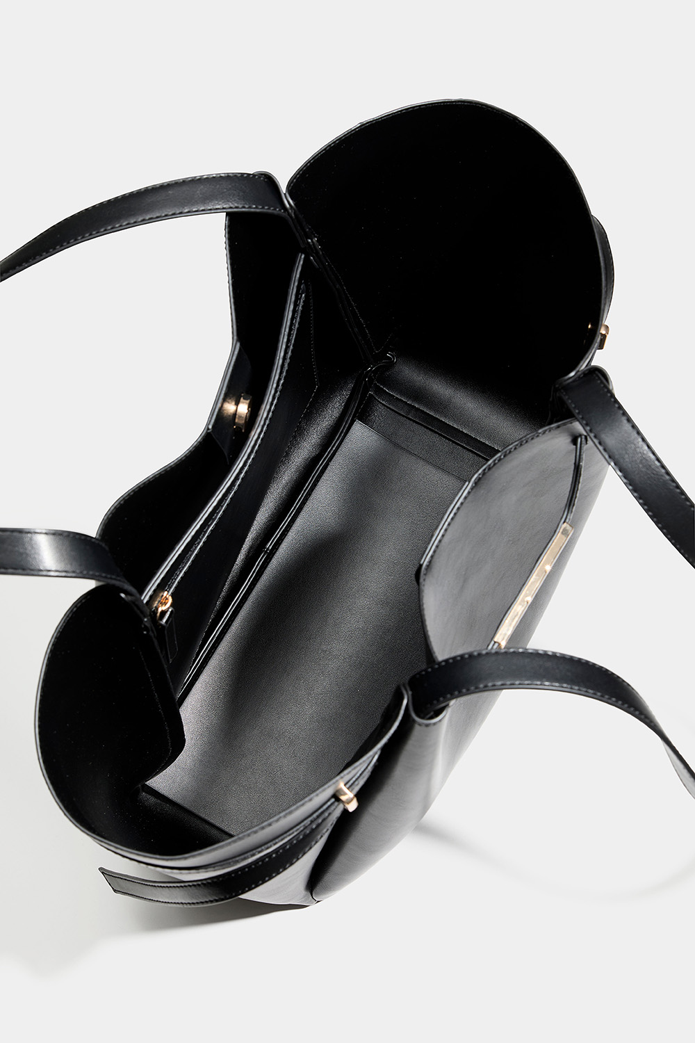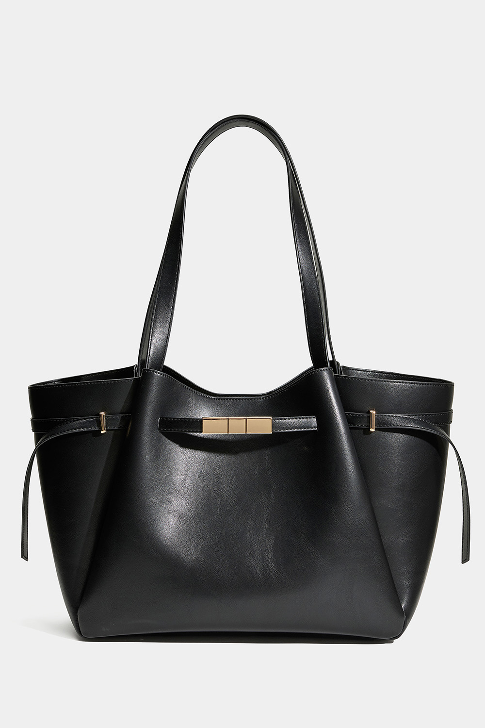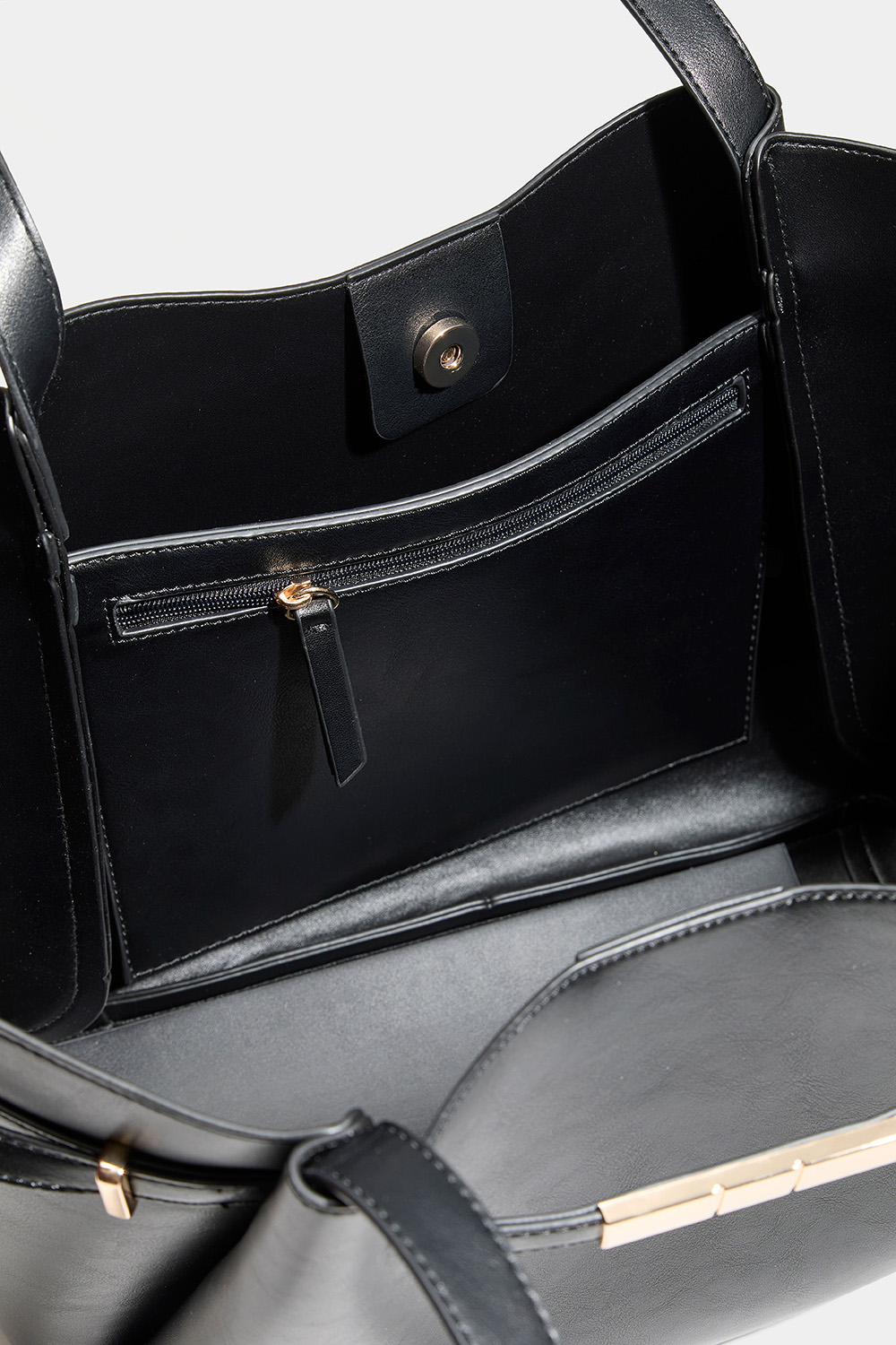 Suuri shopper-kassi, mustaa keinonahkaa kullanvärisellä vyöyksityiskohdalla Laukussa on yksi suurempi magneetilla suljettava tasku ja sisällä pienempi tasku, jossa on vetoketju.