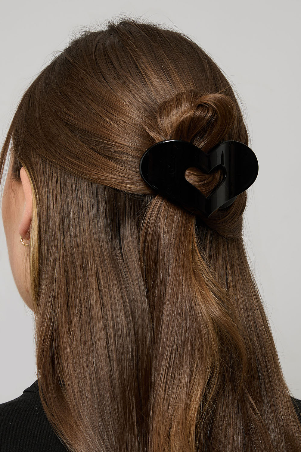 Litteä sydämen muotoinen musta hiusklipsi. Voit nojata taaksepäin vaikkapa autossa tai sohvalla tuntematta mitään takaraivoasi vasten. Klipsi kiinnitetään sivulta ja sitä on helppo käyttää.