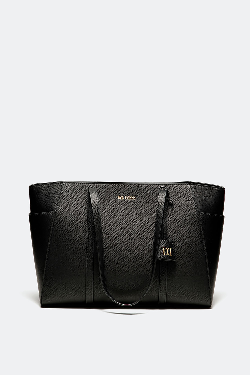 Suuri, musta, saffiano-kuvioinen tote-laukku, jonka etupuolelle on painettu kultainen Don Donna -logo. Tyylikäs, kapeilla tuplakahvoilla varustettu käsilaukku, jossa yhdistyvät muoti ja toimivuus. Laukussa on avaimenperä, kaksi sivutaskua ja pienempää sisätaskua, sekä klassinen vetoketjullinen sisätasku. Täydellinen arkilaukku ja asuste sekä työhön että kouluun.