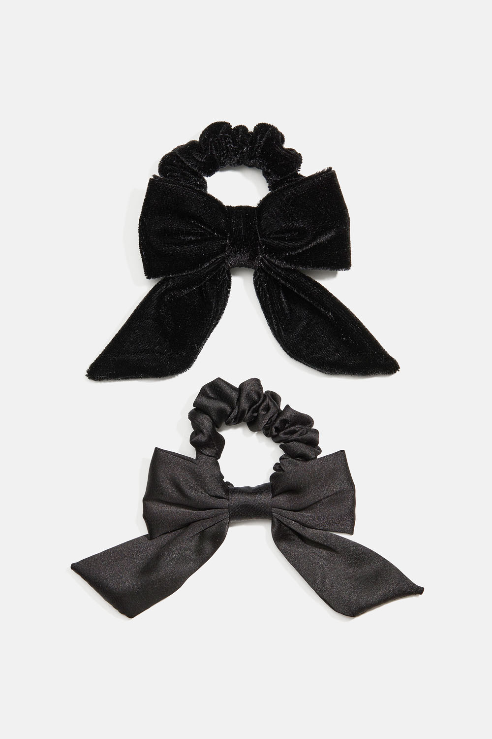 Hiusdonitsit ruseteilla, yksi mustaa samettia ja toinen kiiltävää mustaa kangasta. Kahden soljen pakkaus.