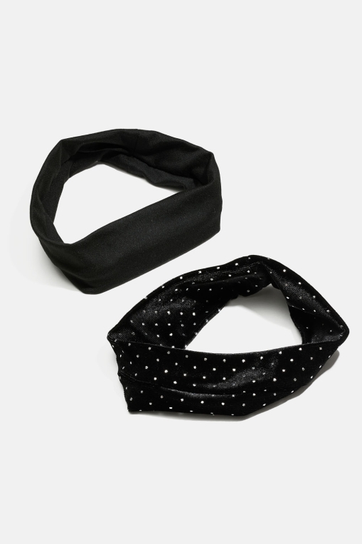 Kaksi kankaista hiuslenkkiä. Yksi klassinen musta ja yksi musta samettinen hiuslenkki, jossa on pieniä hopeisia niittejä.