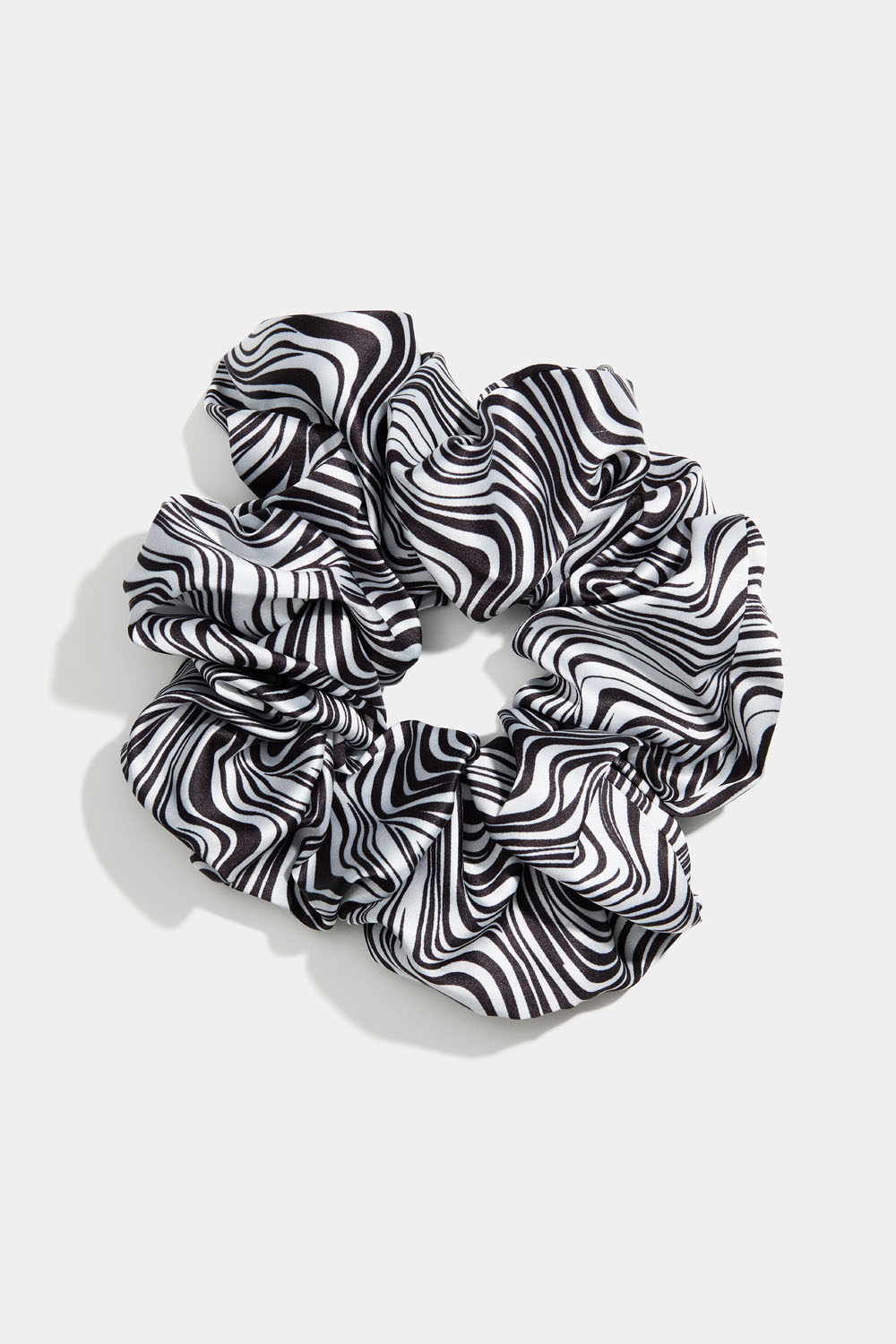 Suuri, mustavalkoinen hiusdonitsi, jossa on ohuita seepraraitoja silkkisessä kankaassa.